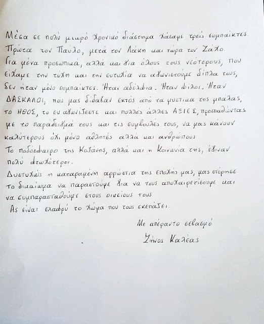 Χειρόγραφη επιστολή του παλαίμαχου παίκτη της Κοζάνης Ζήνου Καλέα σχετικά με την απώλεια των Παύλου Τσακιρίδη, Λάκη Χωλόπουλου και Ζαχαρία Ρατσίσκα.