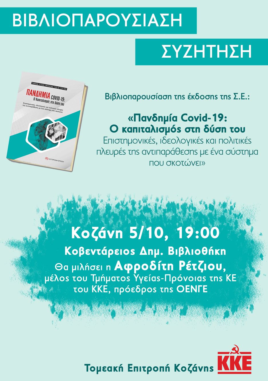 Συζήτηση – βιβλιοπαρουσίαση, “Πανδημία Covid-19: O καπιταλισμός στη Δ΄τση του” την Τετάρτη 5/10, στην Κοβεντάρειο Δημοτική Βιβλιοθήκη Κοζάνης. Παρουσιαση από την Αφροδίτη Ρέτζιου μελος του Τμήματος Υγείας της ΚΕ του ΚΚΕ και πρόεδρος της Ομοσπονδίας Ενωσεων Νοσοκομειακών Γιατρών Ελλάδας (ΟΕΝΓΕ)