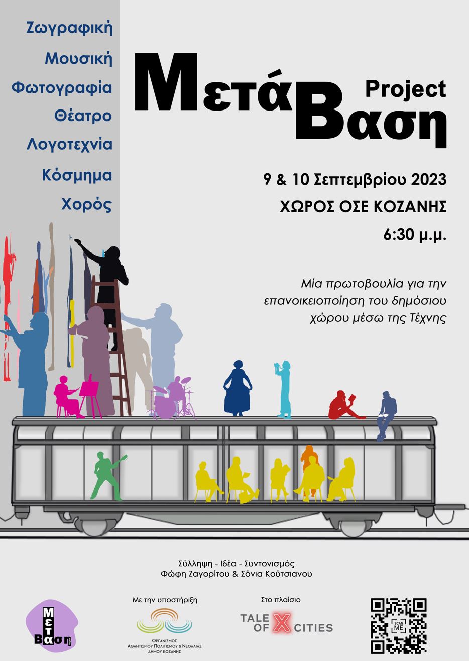 Με κεντρικό μήνυμα «από το ιδιωτικό στο συλλογικό και δημόσιο» το ΜΕΤΑΒΑΣΗ project διοργανώνεται για δεύτερη συνεχόμενη χρονιά. Μια ιδέα για την αναζωογόνηση ενός δημόσιου χώρου “τοπόσημο” για την πόλη μας, κατέληξε να μεταμορφωθεί σε ένα ελπιδοφόρο εγχείρημα για τον τρόπο που μπορούν να αυτενεργήσουν οι κοινότητες σε επίπεδο αυτο- οργάνωσης και αυτο- διαχείρισης με εργαλείο την τέχνη. Καλλιτέχνες της Κοζάνης συναντιούνται, συνομιλούν και συνδημιουργούν μεταξύ τους αλλά και με τους επισκέπτες, σε ένα ανοιχτό εργαστήριο Τεχνών, σε μια κοινή προσπάθεια ενδυνάμωσης της κοινότητας και αναζωογόνησης του δημόσιου χώρου. Η ιδέα και ο συντονισμός της δράσης ανήκουν στις Φώφη Ζαγορίτου και Σόνια Κούτσιανου, στο πλαίσιο του προγράμματος Tale of X Cities με τη στήριξη του Οργανισμού Πολιτισμού – Αθλητισμού και Νεολαίας του Δήμου Κοζάνης.