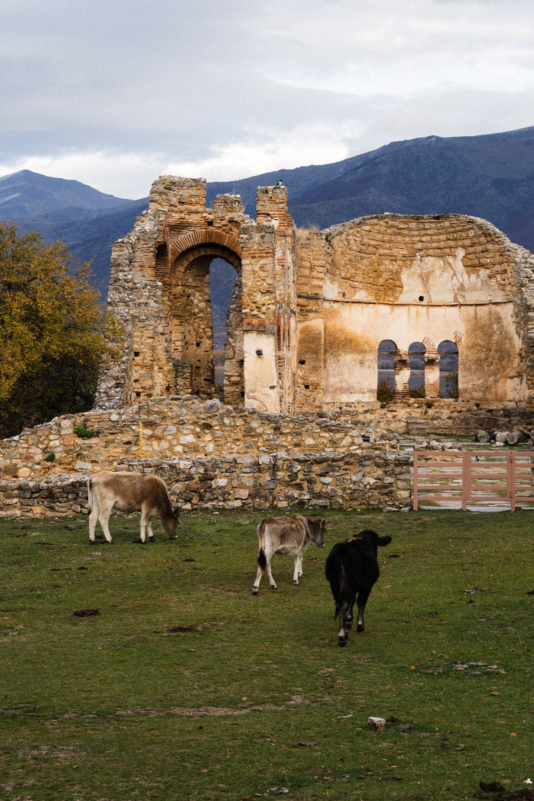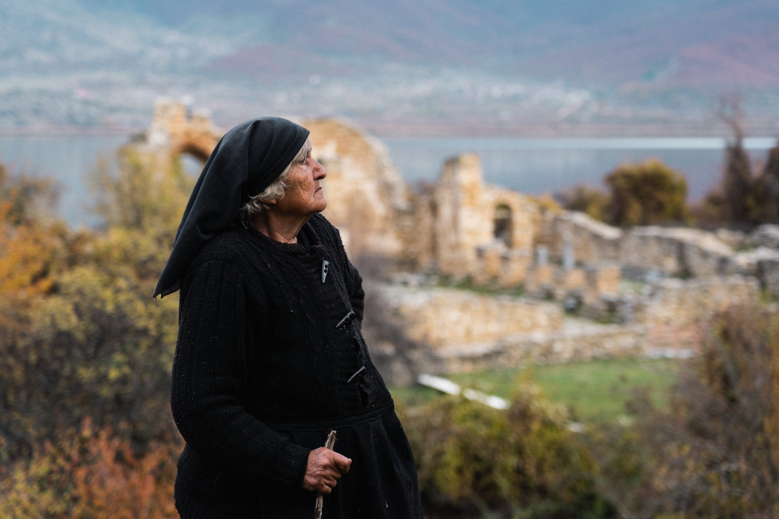 Μέσα στα επόμενα 5 λεπτά βρισκόμαστε παρέα με την κυρία Ελένη στο μονοπάτι, κουβαλώντας το καρότσι της, προς αναζήτηση του κοπαδιού της. Το λιθόστρωτο μονοπάτι μας οδηγεί βαθύτερα στο νησί της λίμνης έως ότου ξεπροβάλλουν τα ερείπια της Βασιλικής του Αγίου Αχίλλειου, τα οποία μεγαλοπρεπώς συντροφεύουν το κοπάδι της κυρίας Ελένης που βόσκει παραδίπλα δημιουργώντας ένα καθόλα βουκολικό τοπίο, σαν σε πίνακα ζωγραφικής. Βρίσκουμε το πιο ψηλό σημείο του νησιού και καθόμαστε απολαμβάνοντας την πανοραμική θέα της λίμνης και της περιοχής που την αγκαλιάζει. Ευγνώμονες για το ταξίδι, τα μέρη και τις εμπειρίες που βιώνουμε αυτές τις δύο ημέρες κατευθυνόμαστε προς το αυτοκίνητο, τον συνοδοιπόρο και το στήριγμά μας.