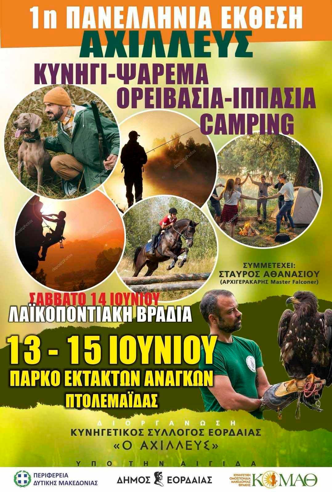 Η πρώτη πανελλήνια έκθεση ΑΧΙΛΛΕΥΣ είναι γεγονός. Ο Κυνηγετικός Σύλλογος Εορδαίας, στο πλαίσιο μιας καινοτόμου πρωτοβουλίας, προχωρά στη διοργάνωση μιας τριήμερης καλοκαιρινής έκθεσης με θέμα: “ΚΥΝΗΓΙ-ΨΑΡΕΜΑ-ΟΡΕΙΒΑΣΙΑ-ΙΠΠΑΣΙΑ-ΚΑΜΠΙΝΚ”.