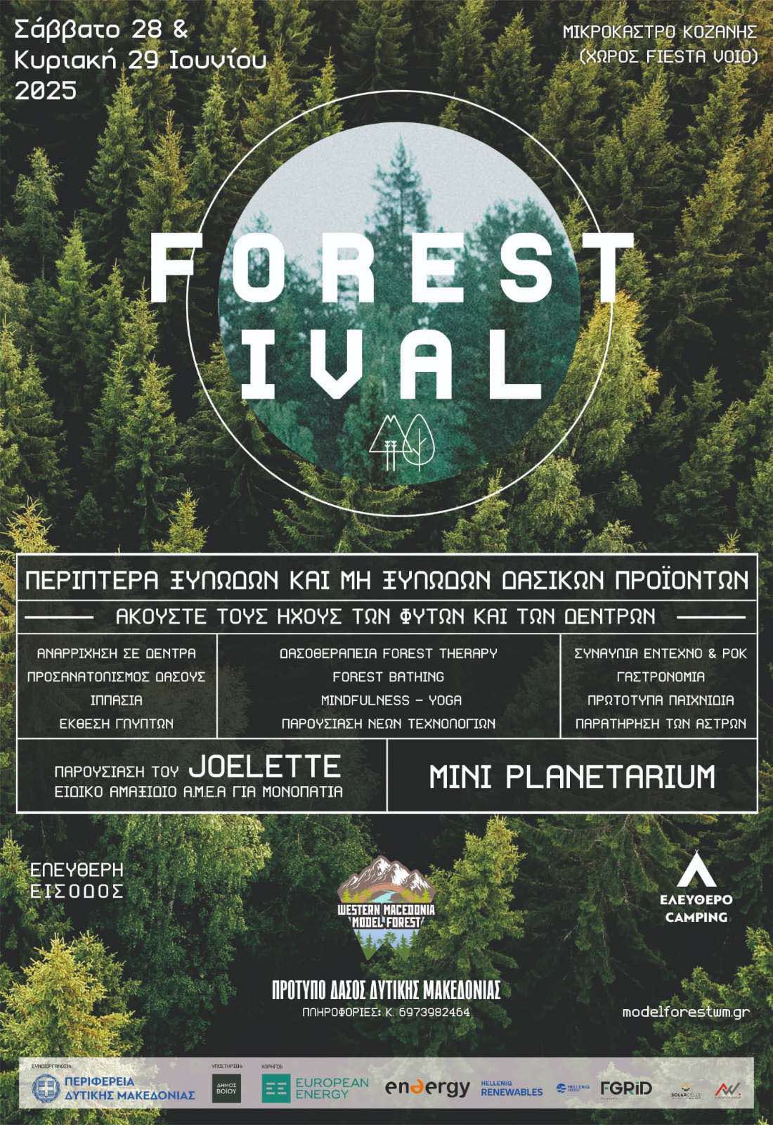 Περίπτερα ξυλωδών και μη ξυλοδών δασικών προϊόντων. Αναρρίχηση σε δέντρα- Προσανατολισμός δάσους- Ιππασία- Έκθεση γλυπτών- Δασοθεραπεία Forest Therapy- Forest Bathing- Mindfulness Yoga- Παρουσίαση νέων τεχνολογιών- Συναυλία έντεχνο και ροκ- Γαστρονομία- Πρωτότυπα παιχνίδια- Παρατήρηση των άστρων- Παρουσίαση του JOLETTE,ειδικό αμαξίδιο Α.Μ.Ε.Α. για μονοπάτια- Mini Planetarioum.