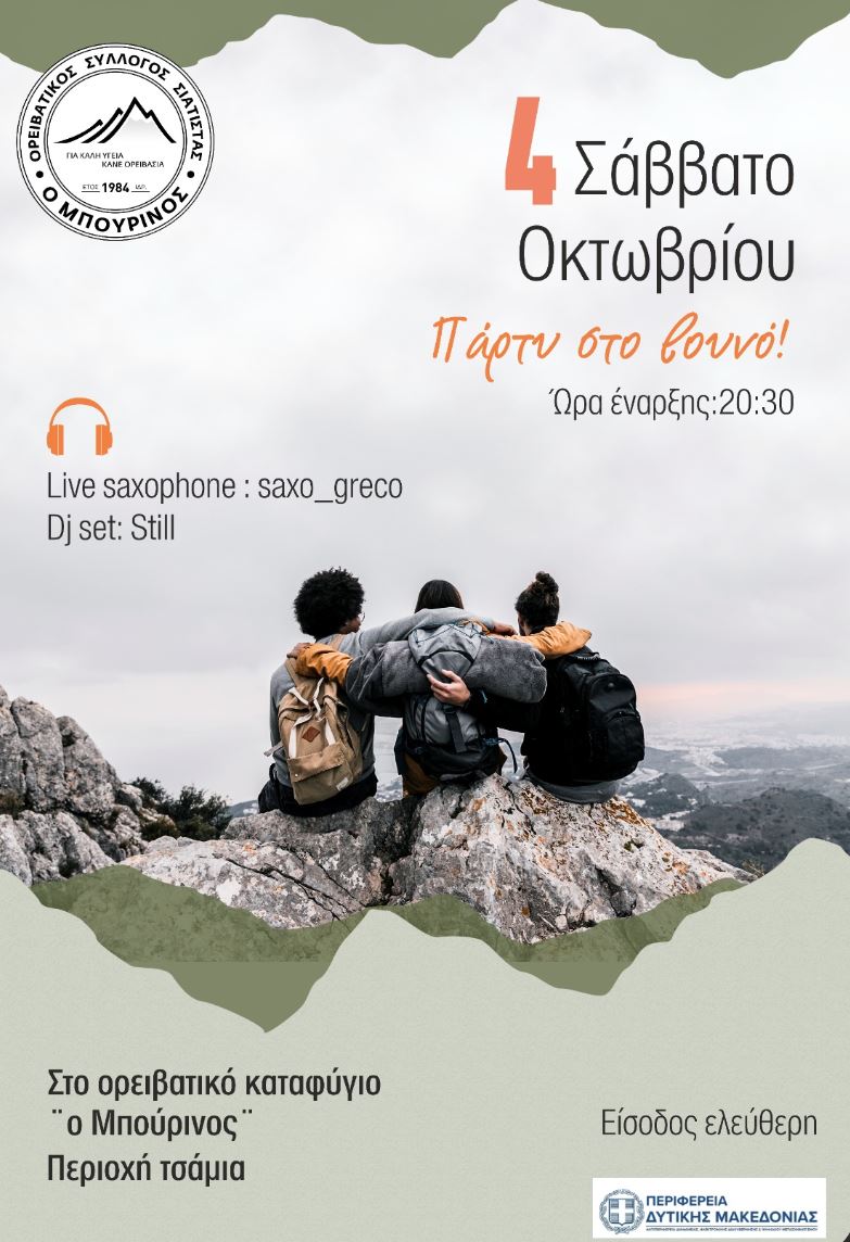 Ο Ορειβατικός Σύλλογος Σιάτιστας “Ο Μπούρινος”, διοργανώνει, με την αρωγή της Περιφερειακής Ενότητας Κοζάνης, μουσική βραδιά, το Σάββατο 4/10/2025 στο καταφύγιο στο Μπούρινο, στις 8:30 μ.μ..