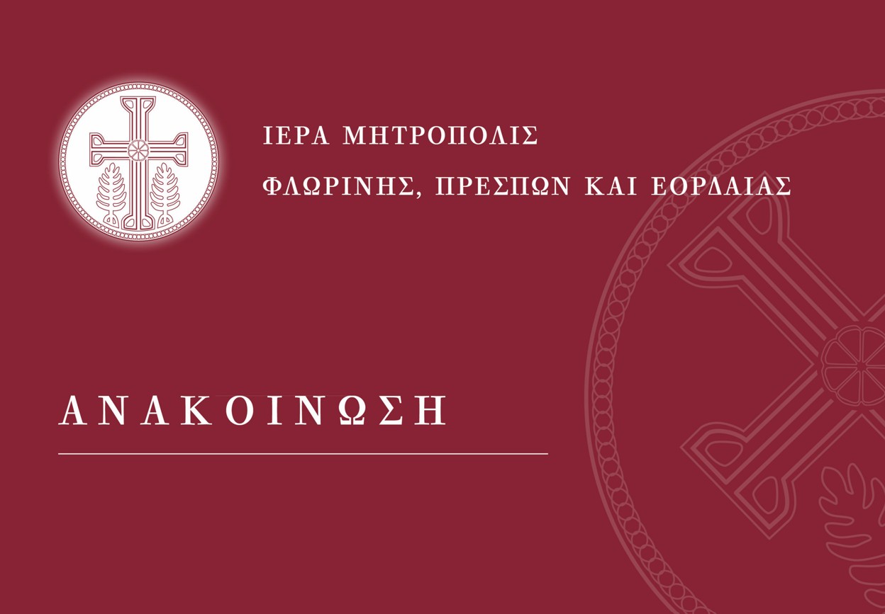 Η Ιερά Μητρόπολις Φλωρίνης, Πρεσπών και Εορδαίας εκφράζει θερμές ευχαριστίες προς όλους τους ευσεβείς χριστιανούς που, με αγάπη και πίστη, συνεχίζουν να καταθέτουν τα χρήματά τους για τα έργα αποκατάστασης του Ιερού Ναού της Αγίας Παρασκευής Φλώρινας.
