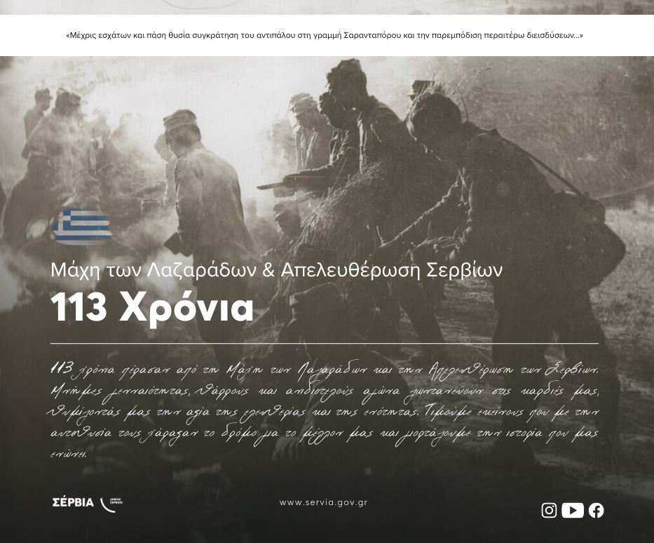 Ο Δήμος Σερβίων σας προσκαλεί να παρευρεθείτε και να τιμήσετε με την παρουσία σας τις εκδηλώσεις που θα πραγματοποιηθούν στις 9 και 10 Οκτωβρίου 2025, με αφορμή την 113η Μάχη των Λαζαράδων και την 113η Απελευθέρωση της πόλης των Σερβίων από τον Τουρκικό ζυγό.