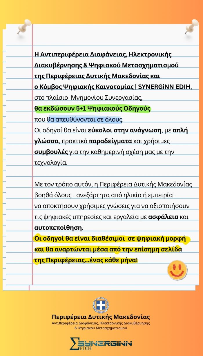 Η Αντιπεριφέρεια Διαφάνειας, Ηλεκτρονικής Διακυβέρνησης & Ψηφιακού Μετασχηματισμού της Περιφέρειας Δυτικής Μακεδονίας και ο Κόμβος Ψηφιακής Καινοτομίας | SYNERGiNNEDIH, στο πλαίσιο Μνημονίου Συνεργασίας, θα εκδώσουν 5+1 Ψηφιακούς Οδηγούς που θα απευθύνονται σε όλους.