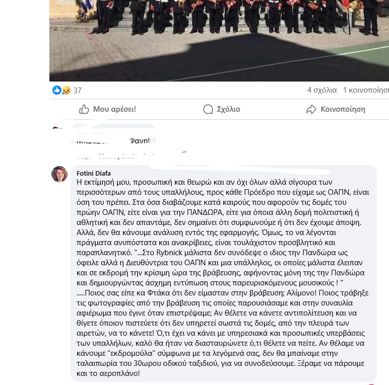 Στο Rybnick μάλιστα δεν συνόδεψε ο ιδιος την Πανδώρα ως όφειλε αλλά η Διευθύντρια του ΟΑΠΝ και μια υπάλληλος, οι οποίες μάλιστα έλειπαν και σε εκδρομή την κρίσιμη ώρα της βράβευσης, αφήνοντας μόνη της την Πανδώρα και δημιουργώντας άσχημη εντύπωση στους παρευρισκόμενους μουσικούς! Ποιος σας είπε κα Φτάκα ότι δεν είμασταν στην βράβευση; Αλίμονο! Ποιος τράβηξε τις φωτογραφίες από την βράβευση τις οποίες παρουσιάσαμε και στην συναυλία αφιέρωμα που έγινε όταν επιστρέψαμε; Αν θέλετε να κάνετε αντιπολίτευση και να θίγετε όποιον πιστεύετε ότι δεν υπηρετεί σωστά τις δομές, από την πλευρά των αιρετών, να το κάνετε! Ό,τι έχει να κάνει με υπηρεσιακά και προσωπικές υπερβάσεις των υπαλλήλων, καλό θα ήταν να διασταυρώνετε ό,τι θέλετε να πείτε.