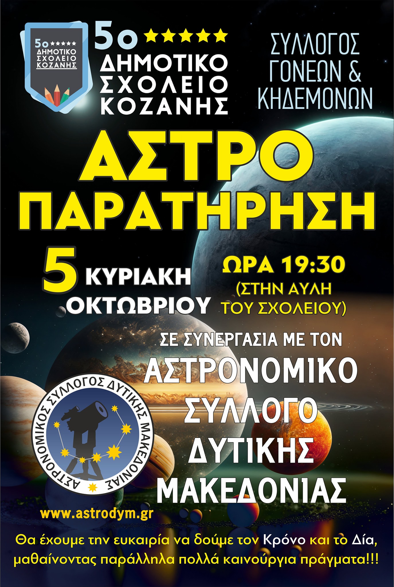 Ο Σύλλογος Γονέων και Κηδεμόνων του Σχολείου μας, σε συνεργασία με τον Αστρονομικό Σύλλογο Δυτικής Μακεδονίας, διοργανώνει μια ξεχωριστή βραδιά αστροπαρατήρησης την Κυριακή 5 Οκτωβρίου 2025, στις 19:30, στην αυλή του 5ου Δημοτικού Σχολείου Κοζάνης.