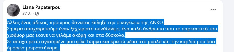 Άλλος ένας άδικος, πρόωρος θάνατος έπληξε την οικογένεια της ΑΝΚΟ. Σήμερα αποχαιρετούμε έναν ξεχωριστό συνάδελφο, ένα καλό άνθρωπο που το σαρκαστικό του χιούμορ μας έκανε να γελάμε ακόμη και στα δύσκολα. Σε αποχαιρετώ αγαπημένε μου φίλε Γιώργο και κρατώ μέσα στο μυαλό και την καρδιά μου όσα όμορφα μοιραστήκαμε.