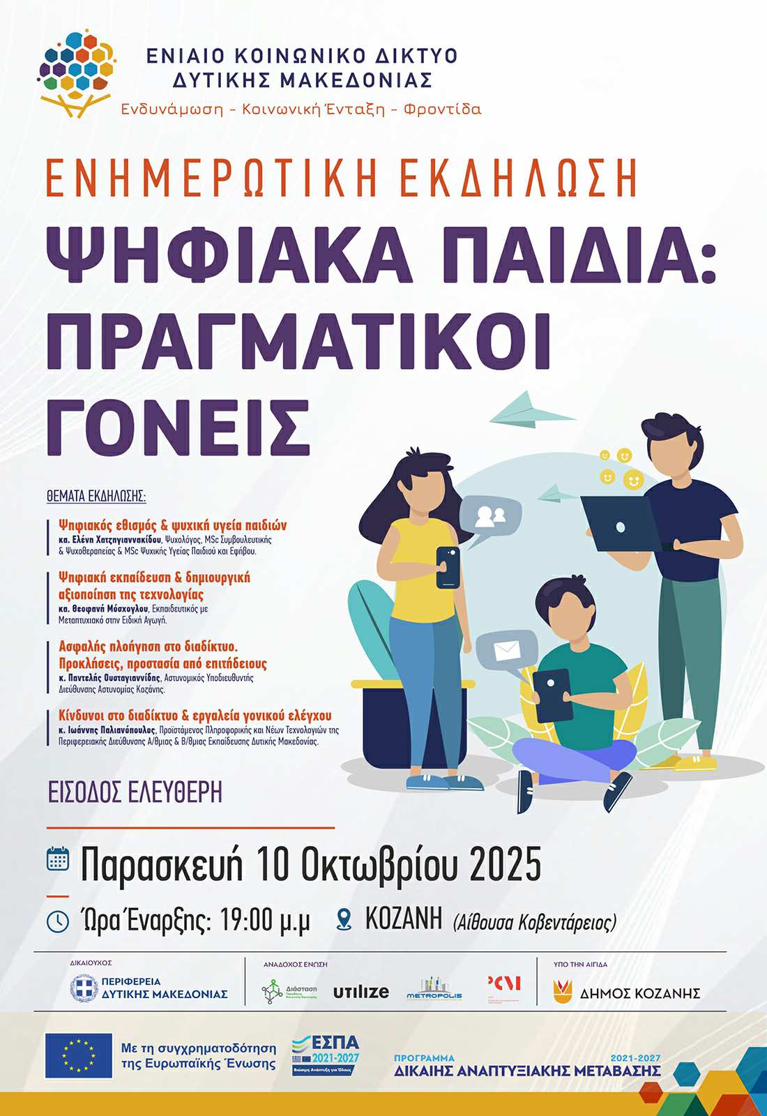 Το Ενιαίο Κοινωνικό Δίκτυο Δυτικής Μακεδονίας διοργανώνει την Παρασκευή 10 Οκτωβρίου 2025, στις 19:00 μ.μ., στην Αίθουσα Κοβεντάρειος στην Κοζάνη, μια ιδιαίτερα ενδιαφέρουσα ενημερωτική εκδήλωση με τίτλο «Ψηφιακά Παιδιά: Πραγματικοί Γονείς».