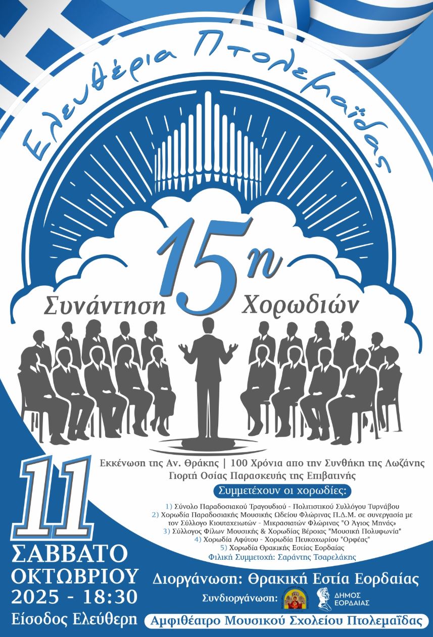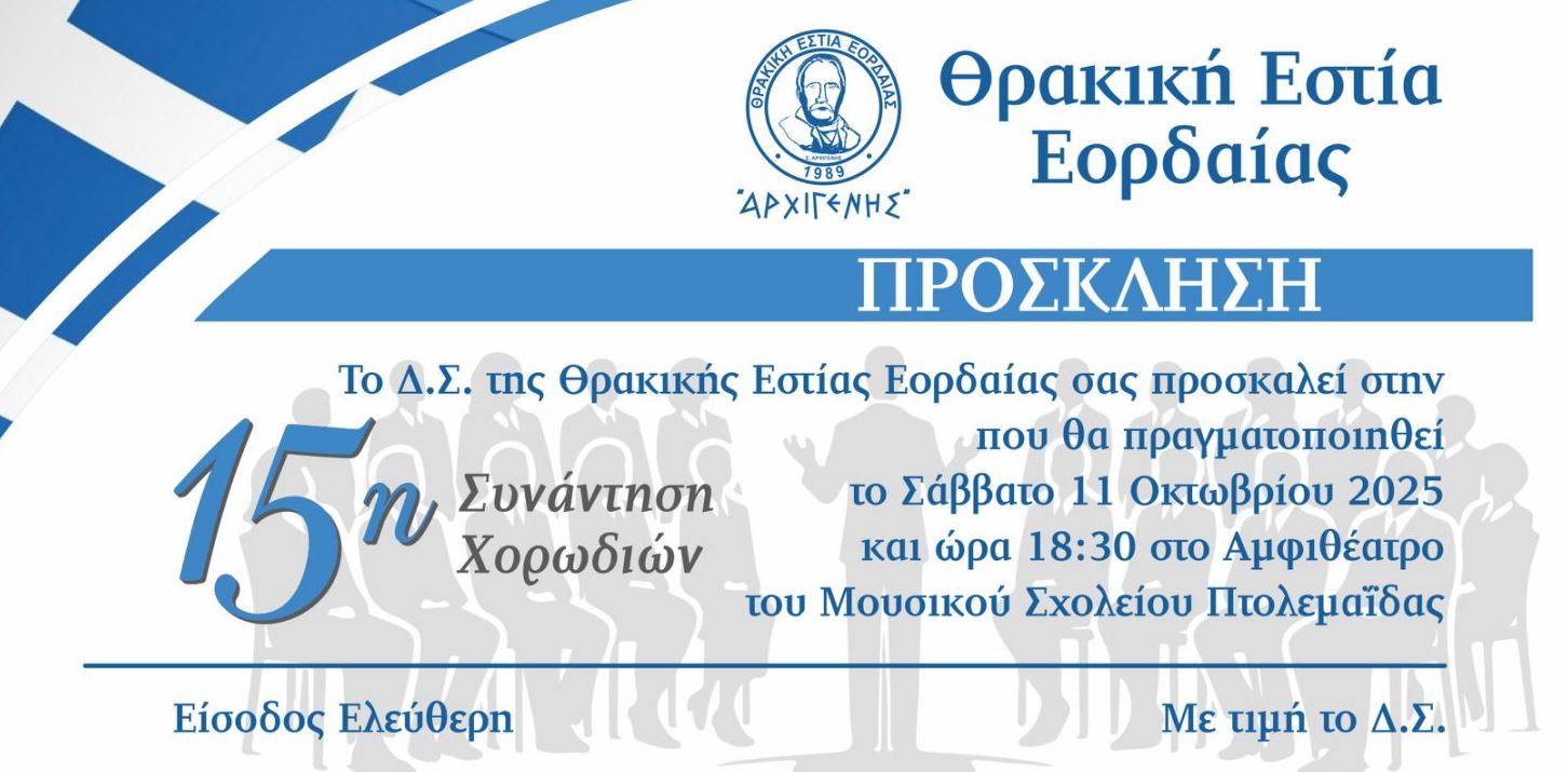 Η Θρακική Εστία Εορδαίας διοργανώνει την 15η Συνάντηση Χορωδιών, το Σάββατο 11 Οκτωβρίου 2025, στις 18:30, στο Αμφιθέατρο του Μουσικού Σχολείου Πτολεμαΐδας, στο πλαίσιο των εορταστικών εκδηλώσεων των «Ελευθερίων Πτολεμαΐδας».