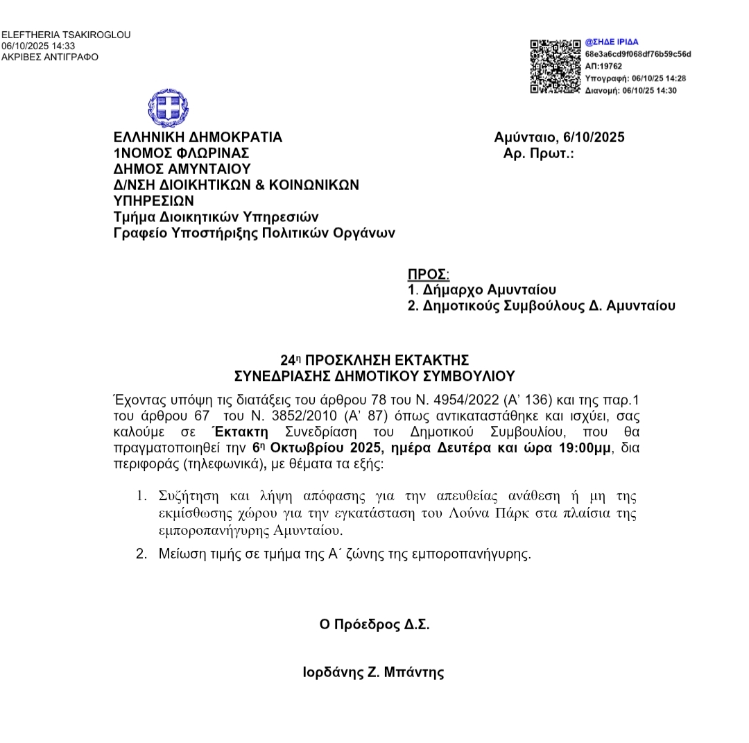 24η Έκτακτη Συνεδρίαση Δημοτικού Συμβουλίου Αμυνταίου