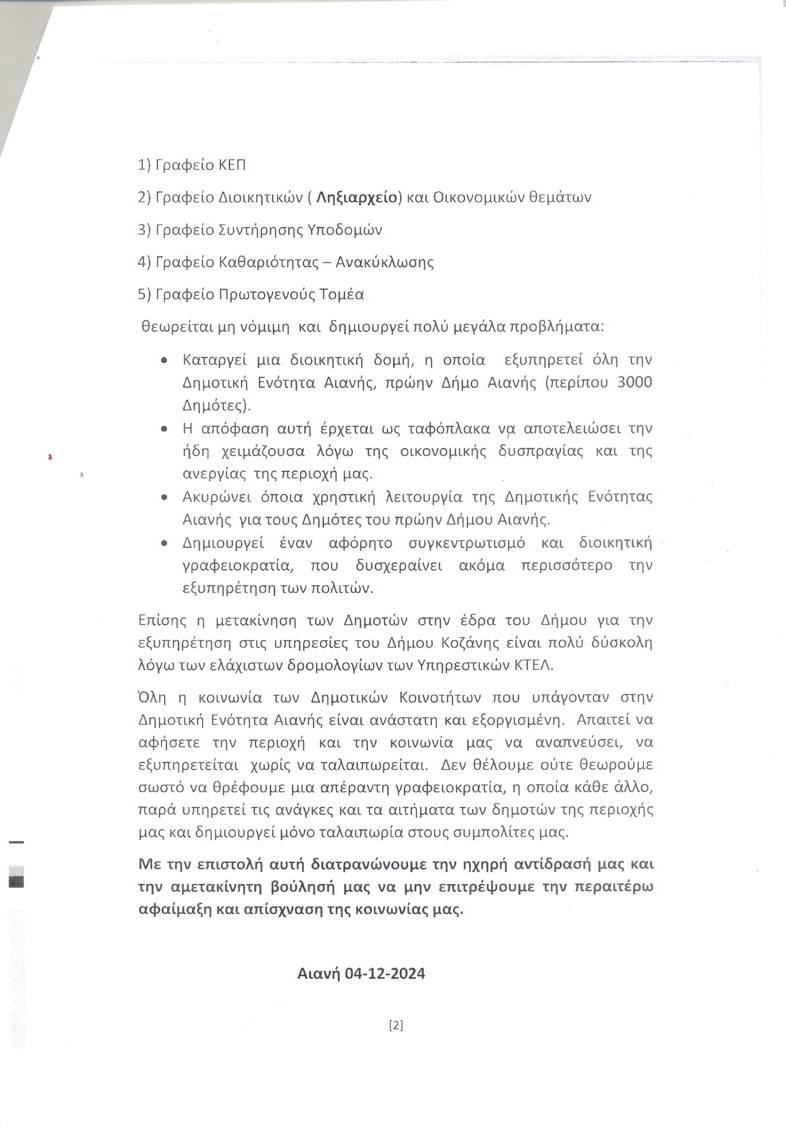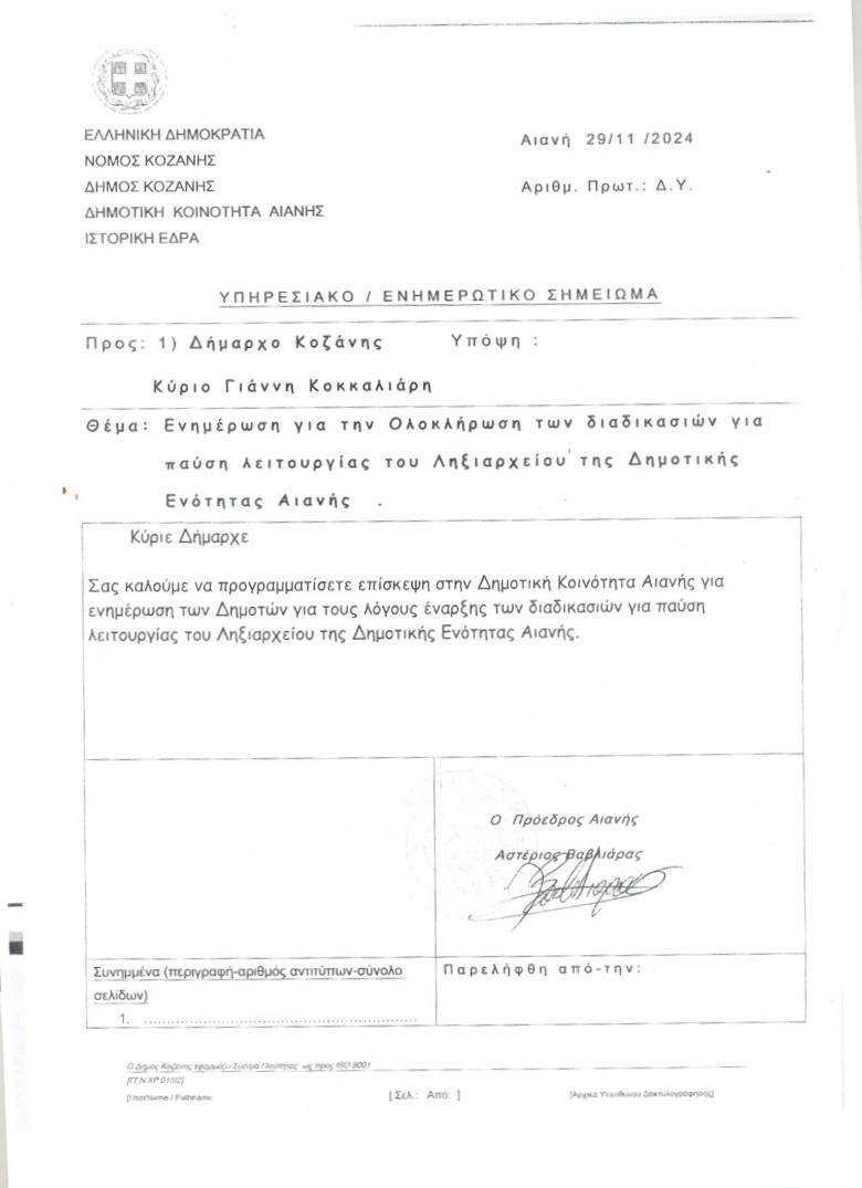 Μετά το έγγραφο το οποίο μας κοινοποιήθηκε από το γραφείο δημάρχου στις 25-11-2024 για την ολοκλήρωση των διαδικασιών της παύσης λειτουργίας του Ληξιαρχείου όπου και το ίδιο βράδυ έγινε συνάντηση όλων των Προέδρων της Δημοτικής Ενότητας Αιανής, στο Γραφείο Δημάρχου Κοζάνης, σύσσωμοι εκφράσαμε όλοι οι πρόεδροι την αντίθεσή μας στην πρόθεση του δημάρχου να στείλει έγγραφο στο Υπουργείο Εσωτερικών για συγχώνευση του Ληξιαρχείου της Δ.Ε. Αιανής.