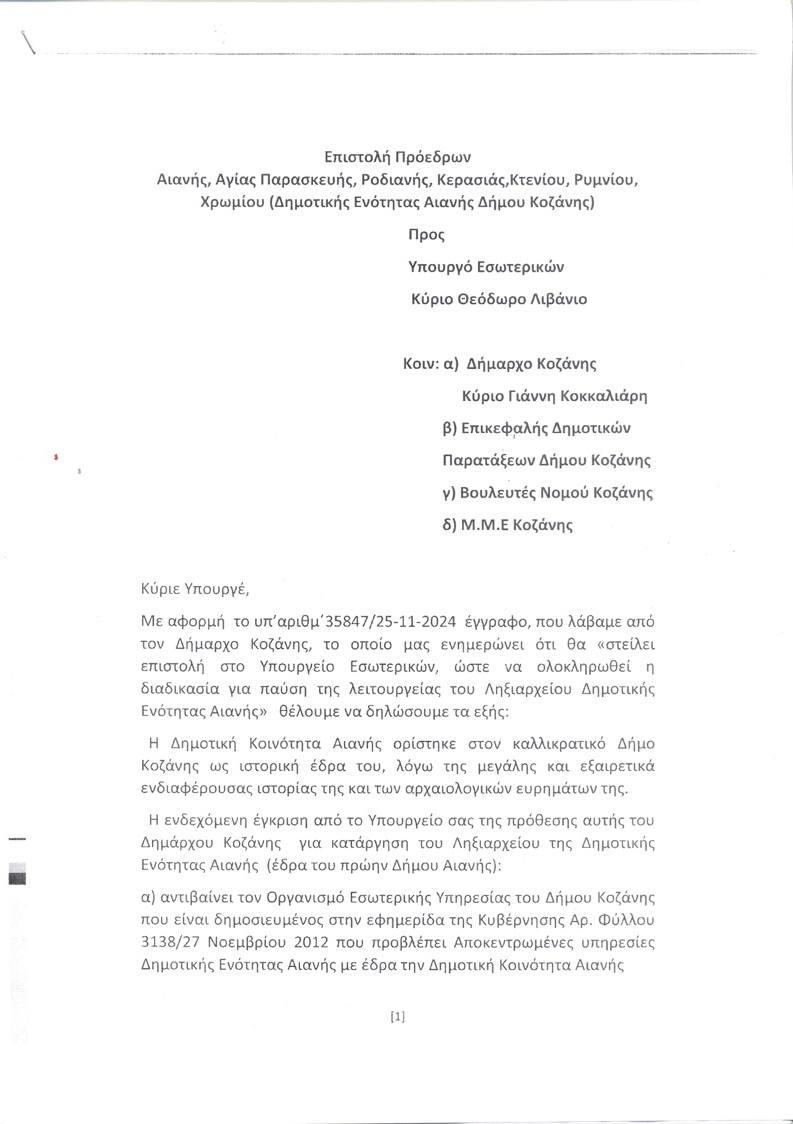 Οι Πρόεδροι της Δημοτικής Ενότητας Αιανής δεν γνώριζαν για το έγγραφο στις 02-12-2024.