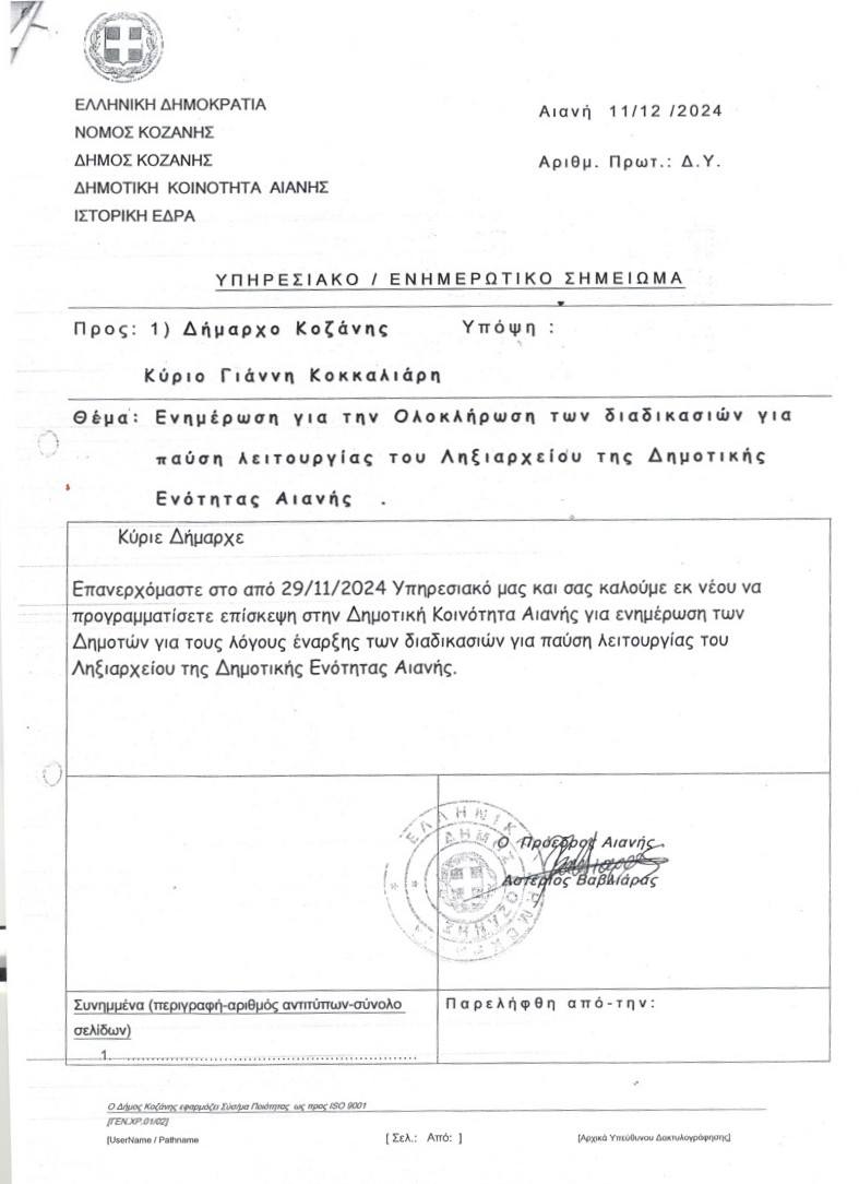Με δύο υπηρεσιακά σημειώματα στις 29-11-2024 και 11-12-2024 καλούσαμε τον Δήμαρχο Κοζάνης να επισκεφτεί την Δημοτική Κοινότητα Αιανής για να ενημερώσει τους πολίτες για τους λόγους που επιμένει στην συγχώνευση του Ληξιαρχείου.