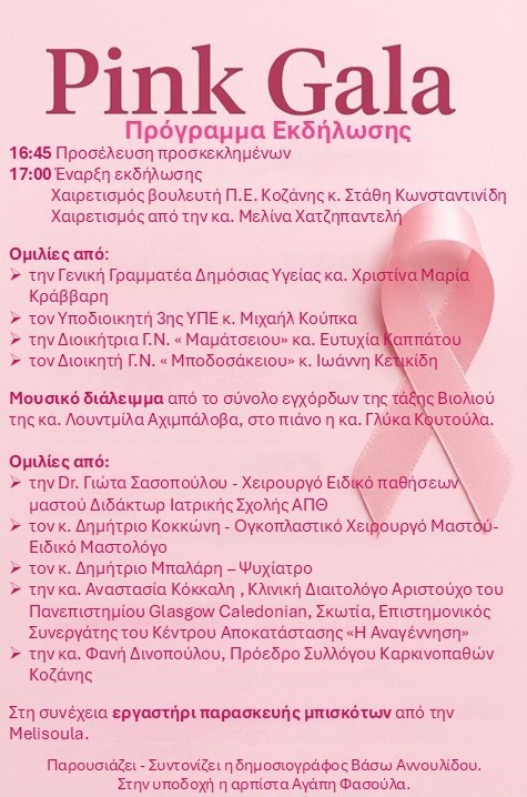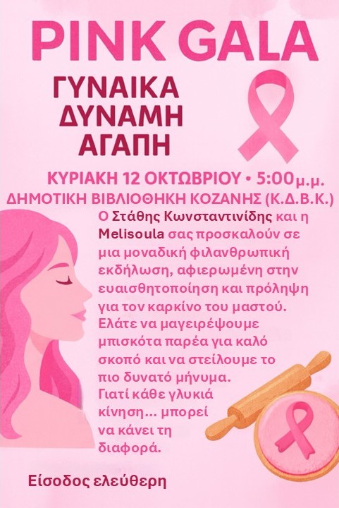 Η εκδήλωση, που έχει τον τίτλο “Pink Gala”, θα πραγματοποιηθεί την Κυριακή 12 Οκτωβρίου στην Κοβεντάρειο Δημοτική Βιβλιοθήκη Κοζάνης στις 5 το απόγευμα και στόχο έχει να ευαισθητοποιήσει το κοινό και να προσφέρει χρήσιμες πληροφορίες για την πρόληψη, την πρώιμη διάγνωση και την αντιμετώπιση του καρκίνου του μαστού.