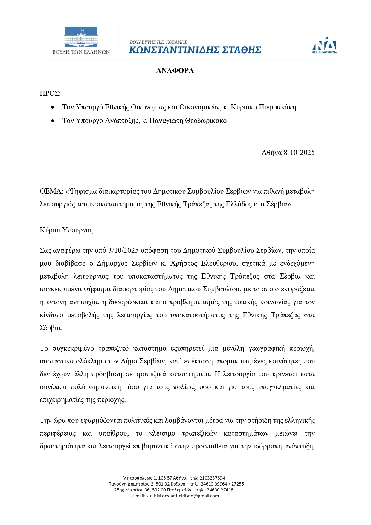 Με την Αναφορά του προς τους Υπουργούς Εθνικής Οικονομίας και Οικονομικών, κ. Κυριάκο Πιερρακάκη και τον Υπουργό Ανάπτυξης, κ. Παναγιώτη Θεοδωρικάκο, ο βουλευτής της ΠΕ Κοζάνης επισημαίνει την έντονη ανησυχία, την δυσαρέσκεια και τον προβληματισμό της τοπικής κοινωνίας για τον κίνδυνο μεταβολής της λειτουργίας του υποκαταστήματος της Εθνικής Τράπεζας στα Σέρβια, που αποτελεί και το μοναδικό στην ευρύτερη περιοχή και εξυπηρετεί ουσιαστικά ολόκληρο τον Δήμο Σερβίων, κατ’ επέκταση απομακρυσμένες κοινότητες που δεν έχουν άλλη πρόσβαση σε τραπεζικά καταστήματα. Η λειτουργία του κρίνεται κατά συνέπεια πολύ σημαντική τόσο για τους πολίτες όσο και για τους επαγγελματίες και επιχειρηματίες.