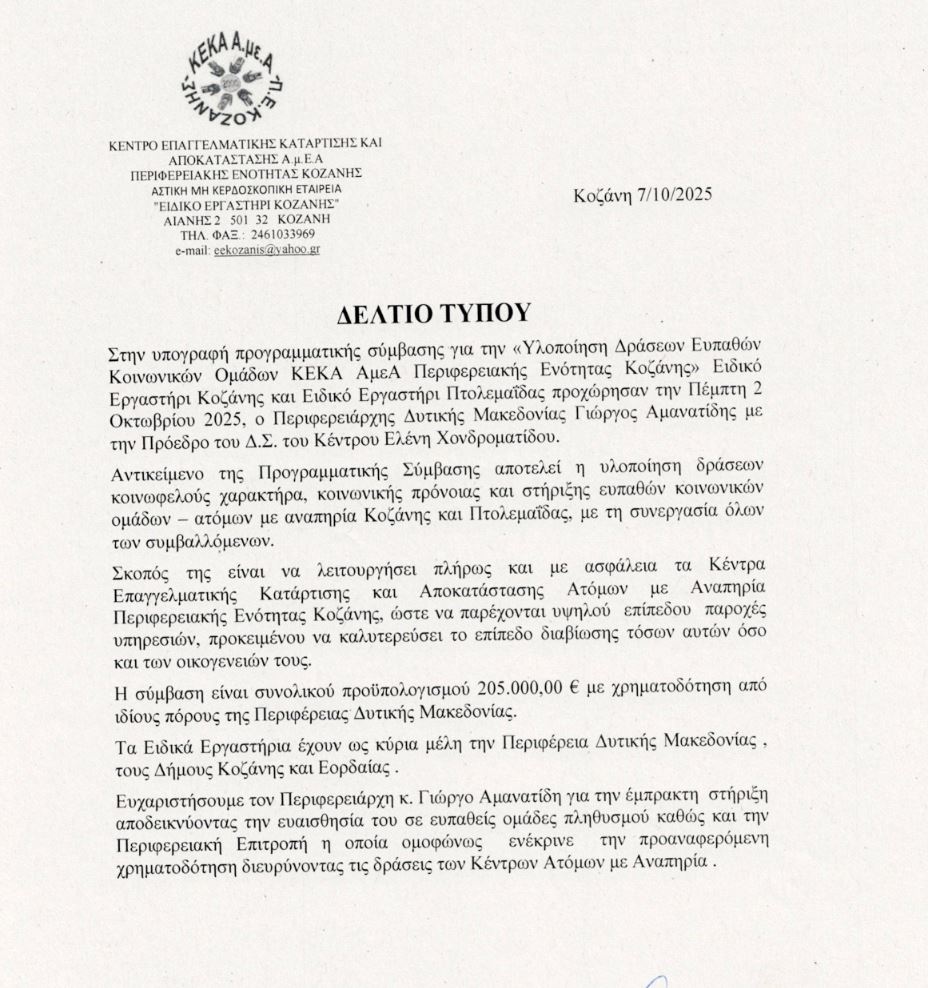 Ευχαριστήριο του ΚΕΚΑ Α.με.Α προς τον Περιφερειάρχη Δυτικής Μακεδονίας Γ. Αμανατίδη