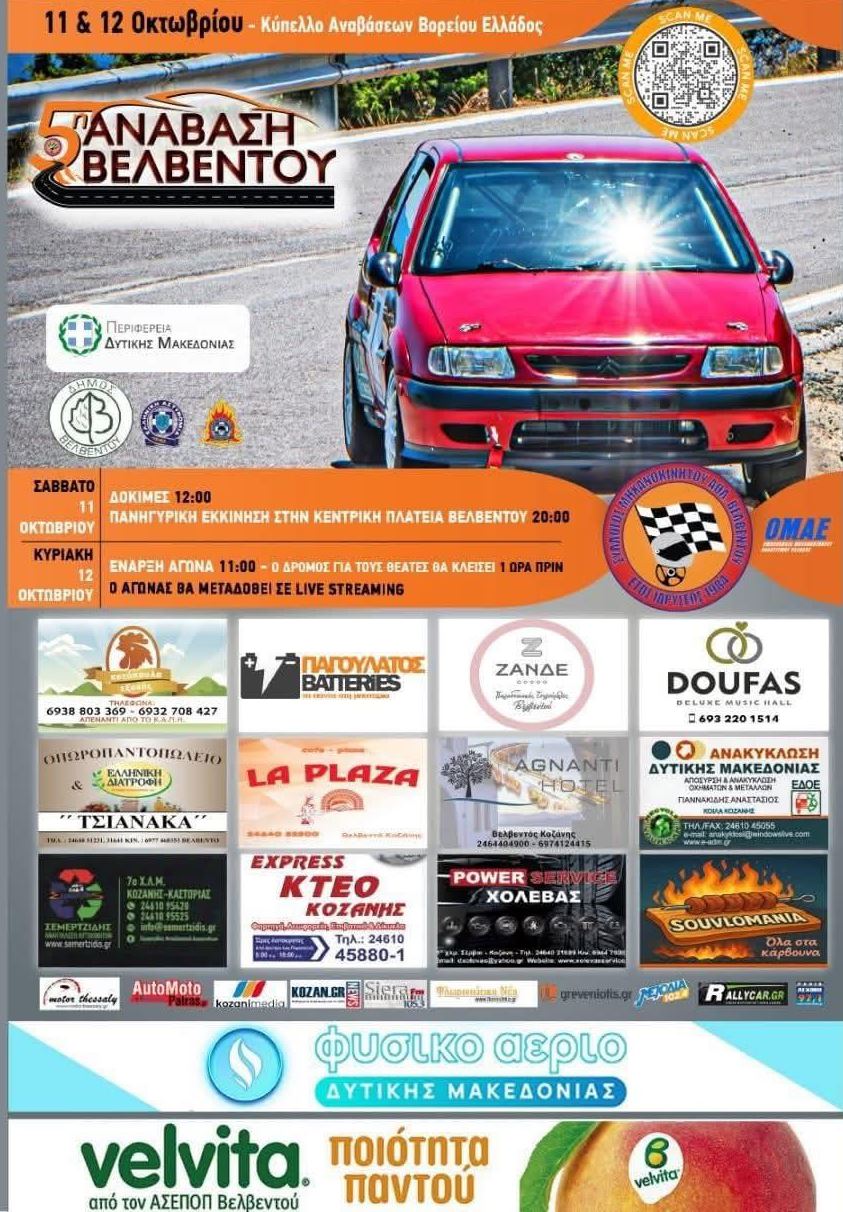 Το Σαββατοκύριακο 11 και 12 Οκτωβρίου το Βελβεντό υποδέχεται ξανά τους λάτρεις του μηχανοκίνητου αθλητισμού, με τη διεξαγωγή της 5ης Ανάβασης Βελβεντού, που αποτελεί μέρος του Κυπέλλου Αναβάσεων Βορείου Ελλάδος.