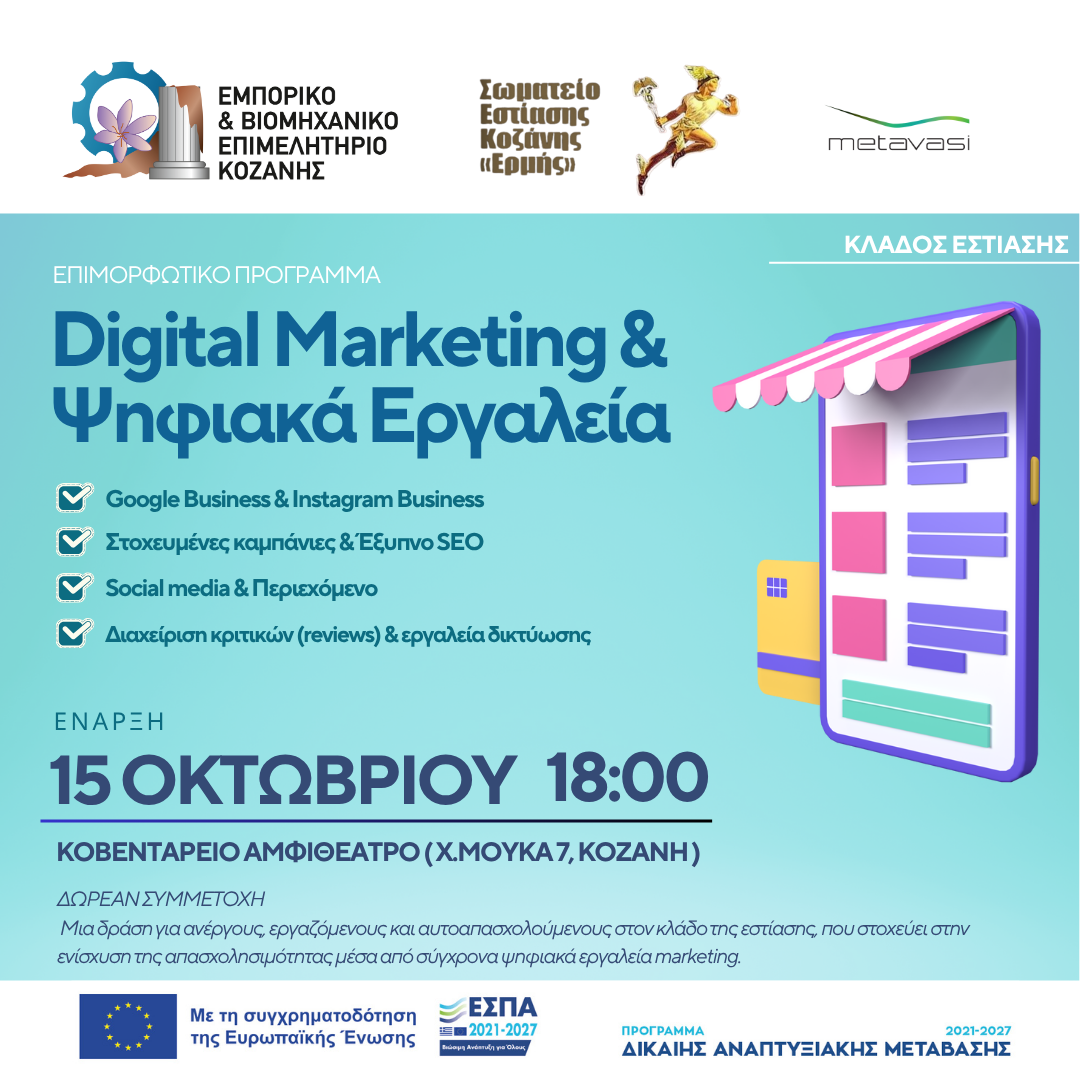 Η Μετάβαση Μ.Α.Ε., σε συνεργασία με το Επιμελητήριο Κοζάνης και το Σωματείο Καφετεριών και Εστίασης Κοζάνης «Ο Ερμής», προχωρούν στην έναρξη ενός νέου, σύγχρονου επιμορφωτικού προγράμματος με τίτλο «Digital Marketing & Ψηφιακά Εργαλεία στην Εστίαση», το οποίο πραγματοποιείται στο πλαίσιο των επιμορφωτικών δράσεων των Κέντρων Ανάπτυξης Δεξιοτήτων και Απασχόλησης.