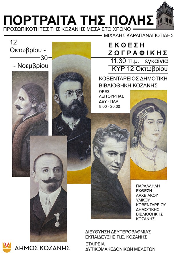 Στο πλαίσιο των Ελευθερίων της Κοζάνης, εγκαινιάζεται την Κυριακή 12 Οκτωβρίου 2025 η έκθεση ζωγραφικής «Πορτραίτα της Πόλης: Προσωπικότητες της Κοζάνης μέσα στον χρόνο» του καλλιτέχνη Μιχάλη Καραπαναγιωτίδη, η οποία θα φιλοξενείται στον χώρο περιοδικών εκθέσεων της Κοβενταρείου Δημοτικής Βιβλιοθήκης Κοζάνης (ΚΔΒΚ), με ελεύθερη είσοδο για το κοινό.