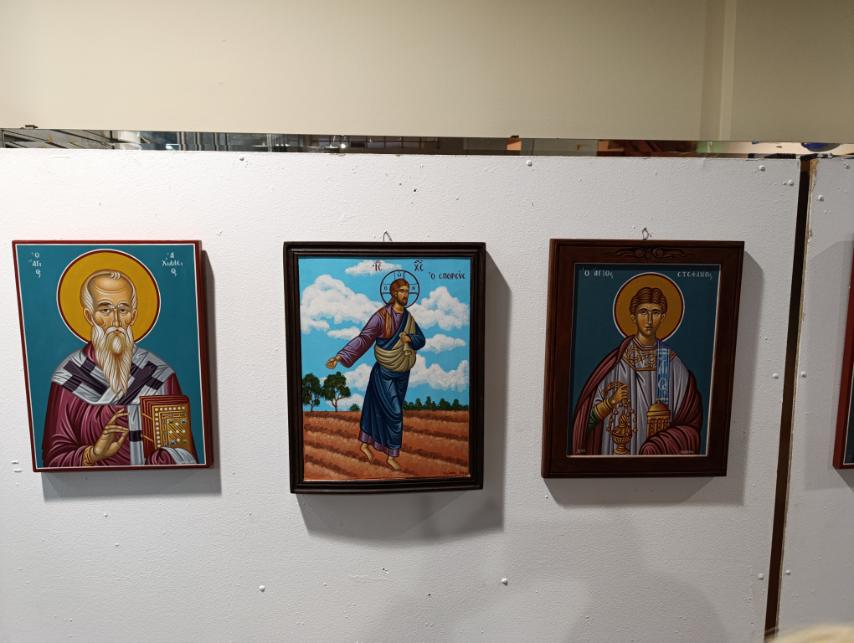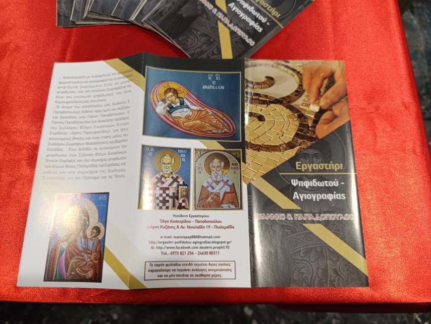 Μια ξεχωριστή Έκθεση Αγιογραφίας και Ψηφιδωτού των καλλιτεχνών Γιάννη και Όλγας Παπαδοπούλου πραγματοποιείται στην Κοζάνη, στην αίθουσα «Φίλιππος» στη Λέσχη Αξιωματικών. Τα εγκαίνια της έκθεσης πραγματοποιήθηκαν το βράδυ της Πέμπτης 9 Οκτωβρίου 2025. Η έκθεση, με τίτλο «Χρωστήρος, Σμίλης & Ψηφίδων», προσφέρει στο κοινό τη δυνατότητα να γνωρίσει από κοντά το έργο δύο καταξιωμένων καλλιτεχνών που υπηρετούν με ευαισθησία και σεβασμό την εκκλησιαστική και παραδοσιακή τέχνη. Μέσα από τις δημιουργίες τους, ο επισκέπτης θα ταξιδέψει στον πνευματικό και αισθητικό κόσμο της αγιογραφίας και του ψηφιδωτού, όπου το φως, το χρώμα και η ύλη αποκτούν ιερό χαρακτήρα. H διοργάνωση της έκθεσης πραγματοποιείται από την 9η Μ/Π Ταξιαρχία και την Ένωση Αποστράτων Αξιωματικών Στρατού / Παράρτημα Κοζάνης, με την υποστήριξη του Δήμου Κοζάνης.