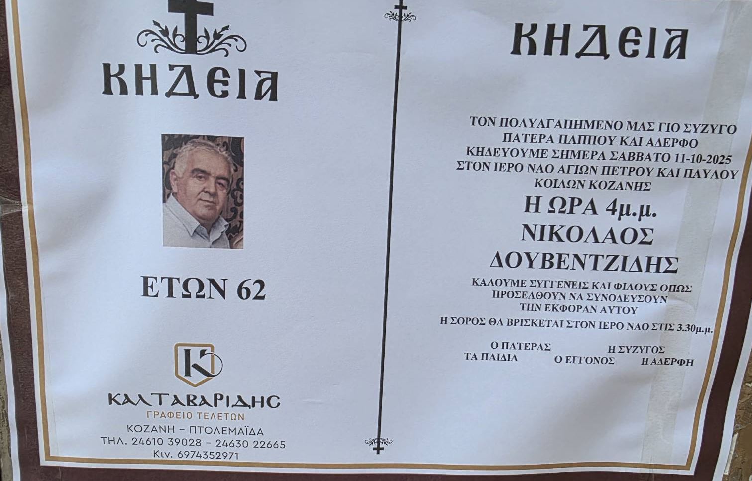 Έφυγε από τη ζωή, σε ηλικία 62 ετών, ο Νικόλαος Δουβεντζίδης. Ήταν επιχειρηματίας (ιδιοκτήτης βενζινάδικου στα Κοίλα Κοζάνης), ιδιαίτερα αγαπητός στην τοπική κοινωνία του χωριού αλλά και της Κοζάνης. H κηδεία του θα γίνει σήμερα Σάββατο στις 4 το μεσημέρι στον Ι.Ν. Αγ. Πέτρων και Παύλου Κοίλων Κοζάνης.