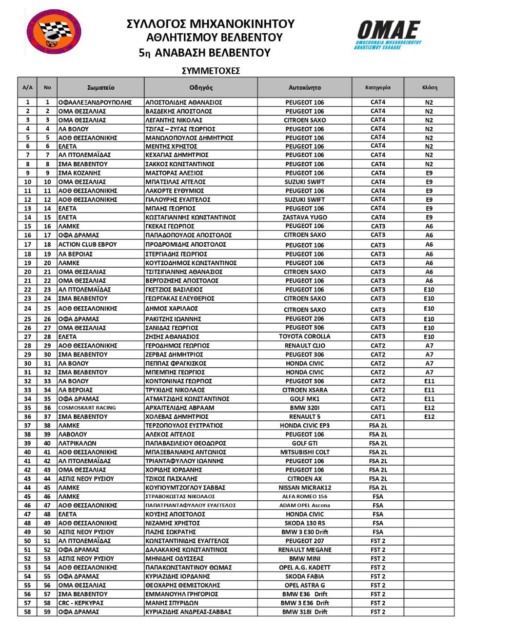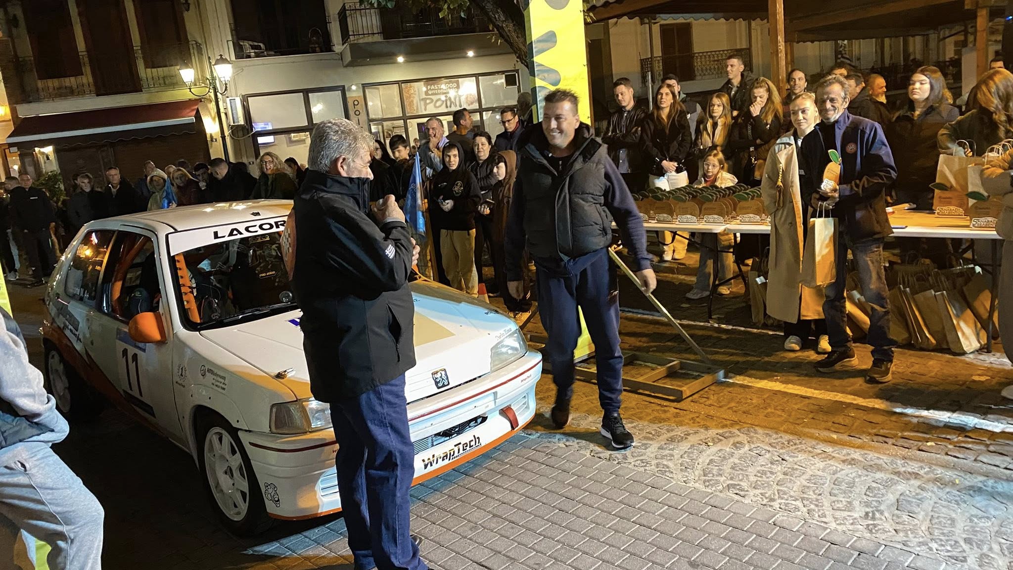 Η Πανηγυρική εκκίνηση, το βράδυ του Σαββάτου 11/10, των αγωνιστικών αυτοκινήτων που θα συμμετάσχουν στην Κυριακάτικη 5η ανάβαση του ΣΜΑΒ στο Βελβεντό.