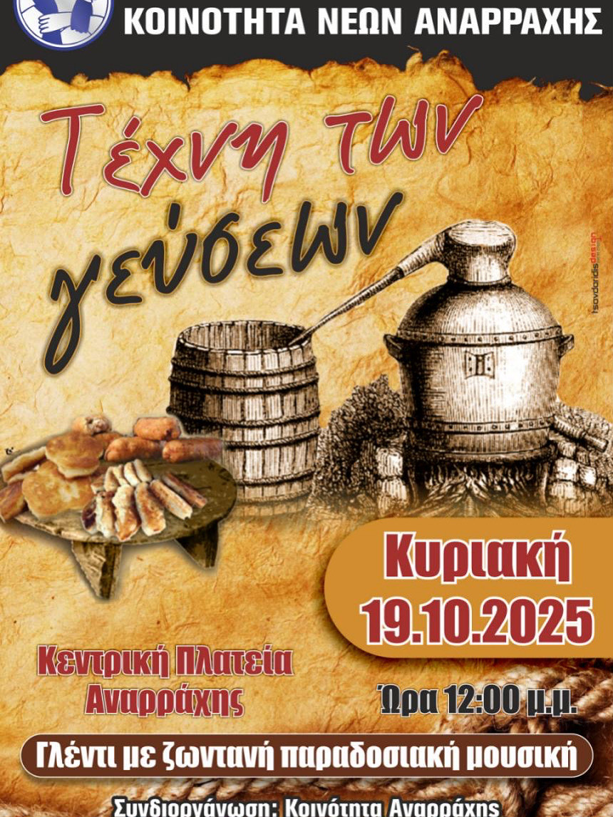 Η Κοινότητα Νέων Αναρράχης σας προσκαλεί την Κυριακή 19 Οκτωβρίου 2025, ώρα 12:00 μ.μ., στην Κεντρική Πλατεία Αναρράχης, να συμμετάσχετε σε μια ξεχωριστή εκδήλωση αφιερωμένη στην τοπική γαστρονομία και παράδοση, με τίτλο «Η Τέχνη των Γεύσεων».