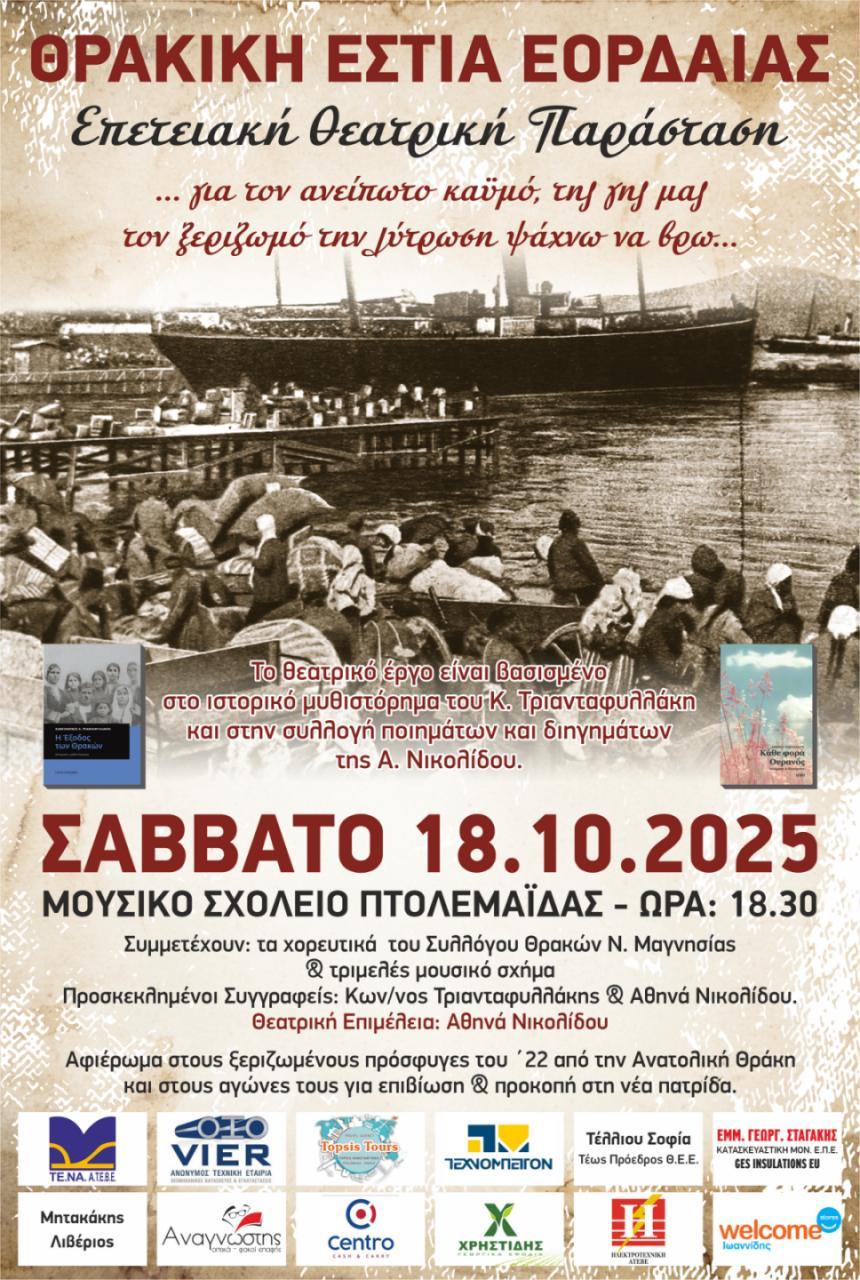 Η εκδήλωση θα λάβει χώρα το Σάββατο 18 Οκτωβρίου 2025 και ώρα 18:30 , στο αμφιθέατρο του Μουσικού Σχολείου Πτολεμαΐδας.