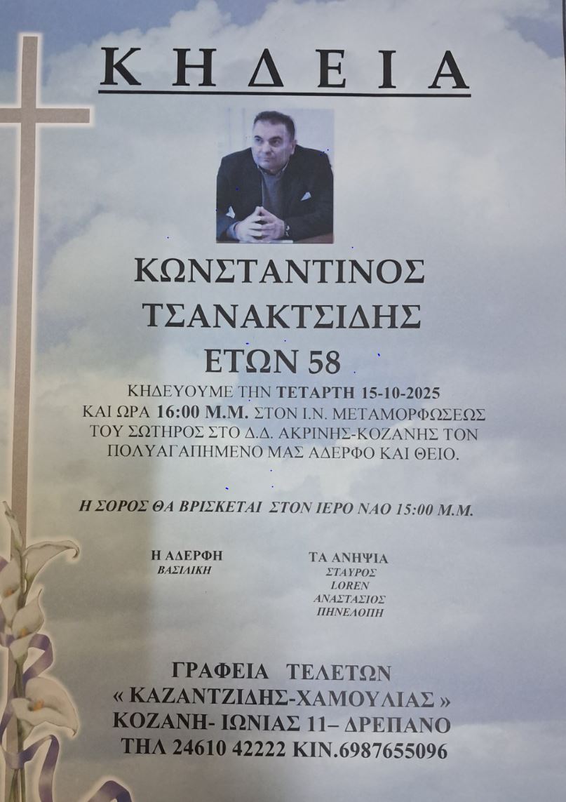 kozan.gr: Την Τετάρτη, 15/10, στις 16:00, στην Ακρινή Κοζάνης, η κηδεία του Κωνσταντίνου Τσανακτσίδη