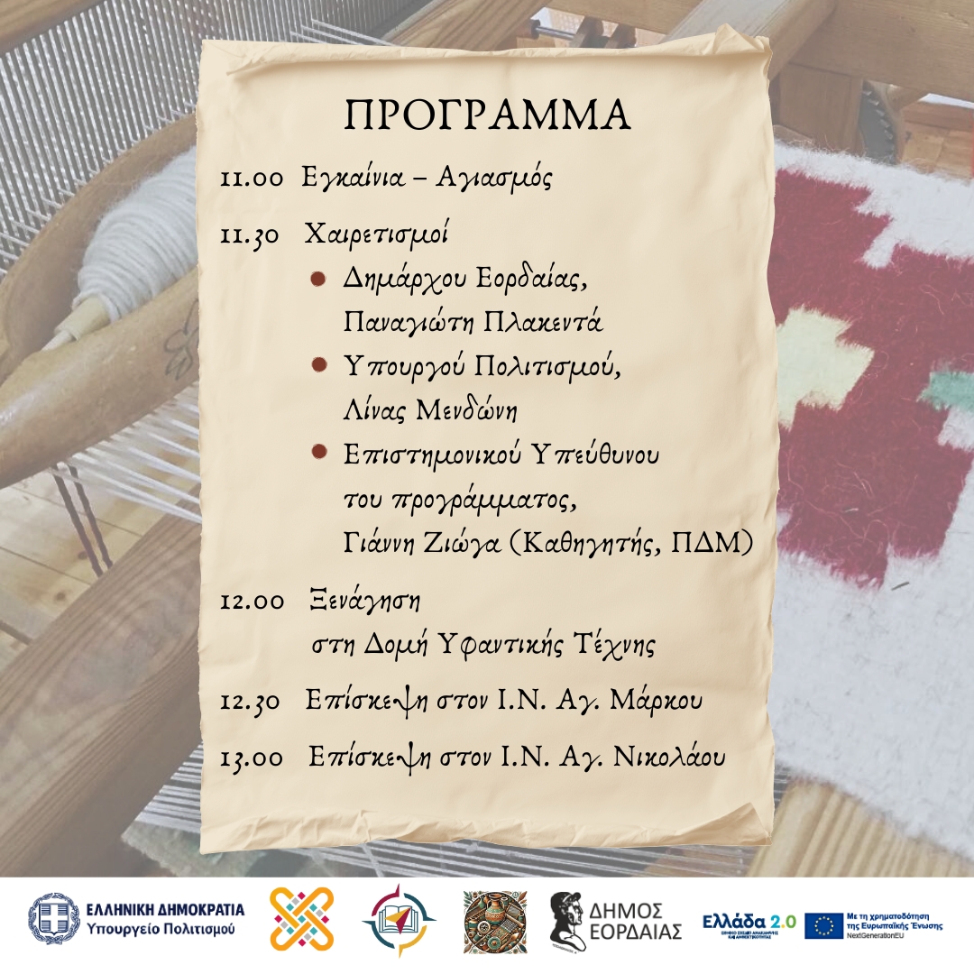 Στο πλαίσιο της επίσκεψής της στην περιοχή θα λάβουν χώρα και τα εγκαίνια της Δομής Υφαντικής Τέχνης στη Βλάστη του Δήμου Εορδαίας το Σάββατο 18 Οκτωβρίου 2025 και ώρα 11:00.