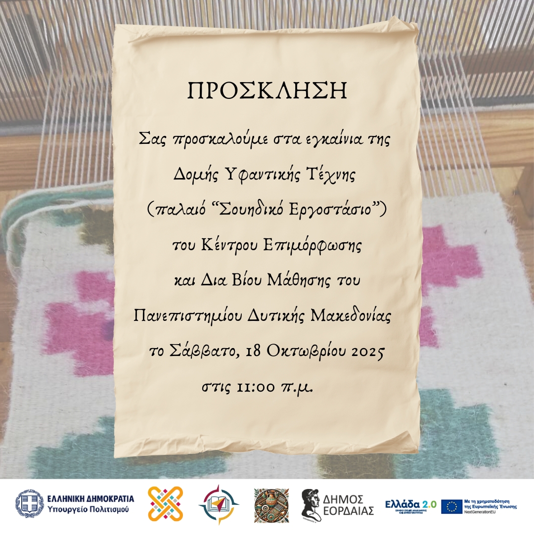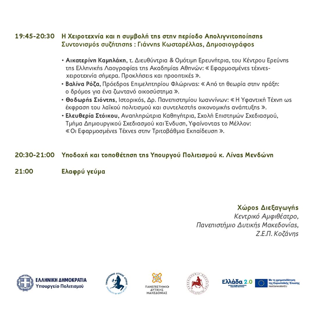Το Υπουργείο Πολιτισμού σε συνεργασία με το Πανεπιστήμιο Δυτικής Μακεδονίας, το Πανεπιστήμιο Θεσσαλίας και το Πανεπιστήμιο Δυτικής Αττικής οργανώνει ημερίδα με θέμα: «Η Ελληνική Χειροτεχνία στη Δυτική Μακεδονία του σήμερα».
