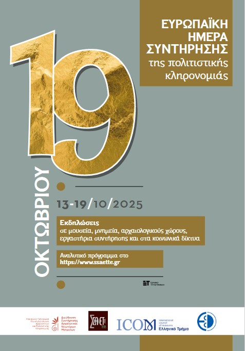 Ενημερώνουμε επίσης το ενδιαφερόμενο κοινό ότι η προγραμματισμένη για το Σάββατο 18 Οκτωβρίου εκδήλωση παρουσίασης του βιβλίου της συντηρήτριας κ. Μαρίνας Λυκιαρδοπούλου με τίτλο «Συντήρηση Αρχαιοτήτων και Έργων Τέχνης Ιστορική εξέλιξη και ανάλυση εννοιών», αναβάλλεται. Η νέα ημερομηνία θα γνωστοποιηθεί εγκαίρως.
