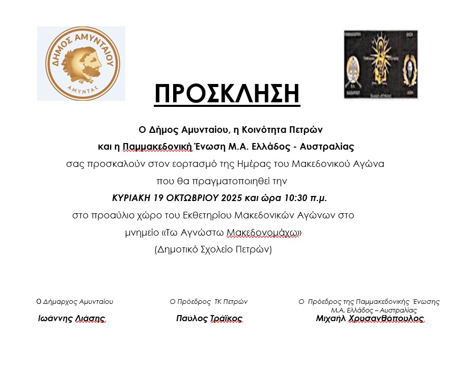 Ο Δήμος Αμυνταίου, η Κοινότητα Πετρών και η Παμμακεδονική Ένωση Μ.Α. Ελλάδος – Αυστραλίας σας προσκαλούν στον εορτασμό της Ημέρας του Μακεδονικού Αγώνα που θα πραγματοποιηθεί την ΚΥΡΙΑΚΗ 19 ΟΚΤΩΒΡΙΟΥ 2025 και ώρα 10:30 π.μ. στο προαύλιο χώρο του Εκθετηρίου Μακεδονικών Αγώνων στο μνημείο «Τω Αγνώστω Μακεδονομάχω» (Δημοτικό Σχολείο Πετρών)