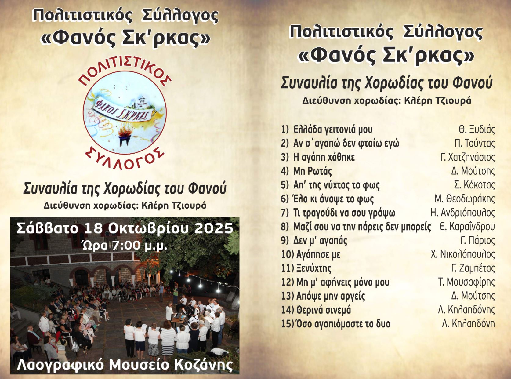 Ο Πολιτιστικός Σύλλογος «Φανός Σκ’ρκας» σας προσκαλεί στη Συναυλία της Χορωδίας του Φανού το Σάββατο 18 Οκτωβρίου 2025 και ώρα 7:00 το απόγευμα στο Λαογραφικό Μουσείο Κοζάνης