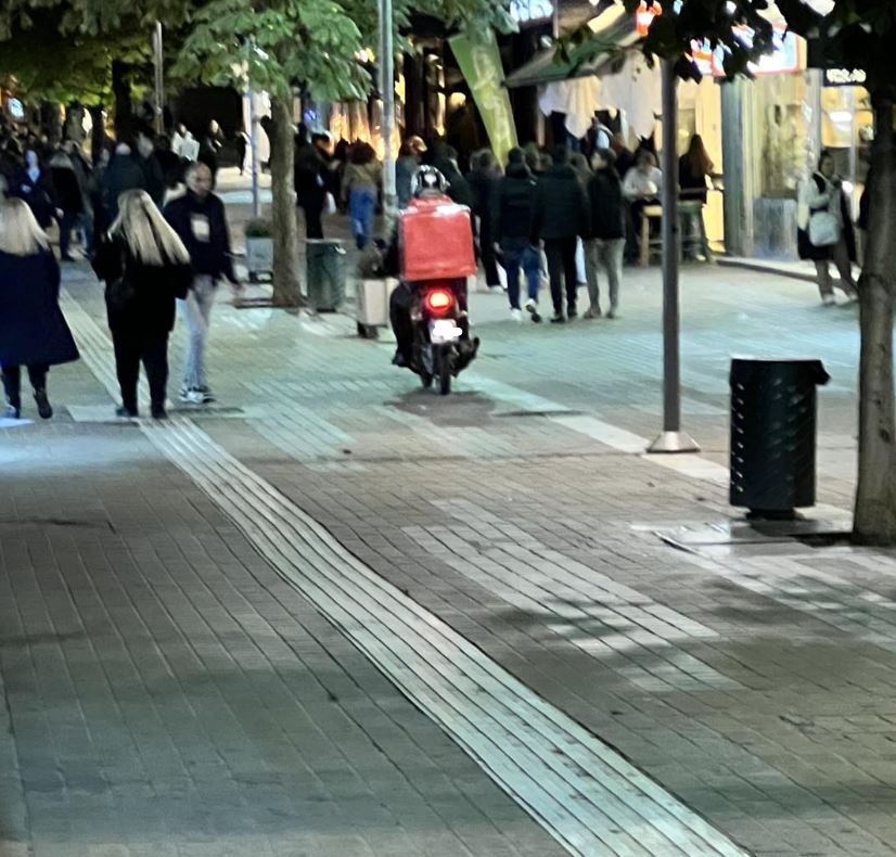 Ο κεντρικός πεζόδρομος της πόλης δεν είναι δρόμος ταχείας κυκλοφορίας και η διέλευση μηχανών αποτελεί πραγματικό κίνδυνο για τη σωματική ασφάλεια όσων κινούνται εκεί καθημερινά. Απευθύνομαι μέσα από την σελίδα σας με σεβασμό σε αυτούς τους εργαζόμενους. Από τη στιγμή που κάποιοι συνάδελφοί σας αποδεικνύουν ότι μπορούν να κάνουν σωστά τη δουλειά τους, τηρώντας τους κανόνες, σημαίνει πως γίνεται. Το να μη σέβεστε τον χώρο των πεζών δεν είναι ανάγκη, είναι επιλογή. Μην μας αγνοείτε. Η φωτογραφία που σας στέλνω είναι Σάββατο βράδυ.