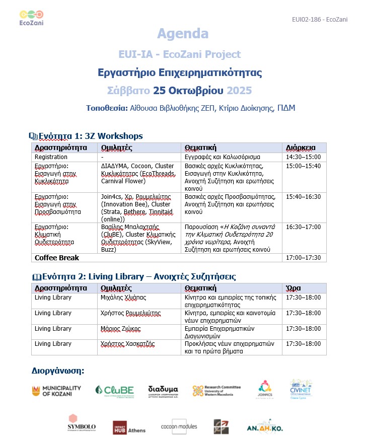 Με χαρά σας προσκαλούμε στο Εργαστήριο επιχειρηματικότητας που θα πραγματοποιηθεί στο πλαίσιο του έργου EcoZani, αφιερωμένο στη δημιουργικότητα, τη συνεργασία και την καινοτομία.