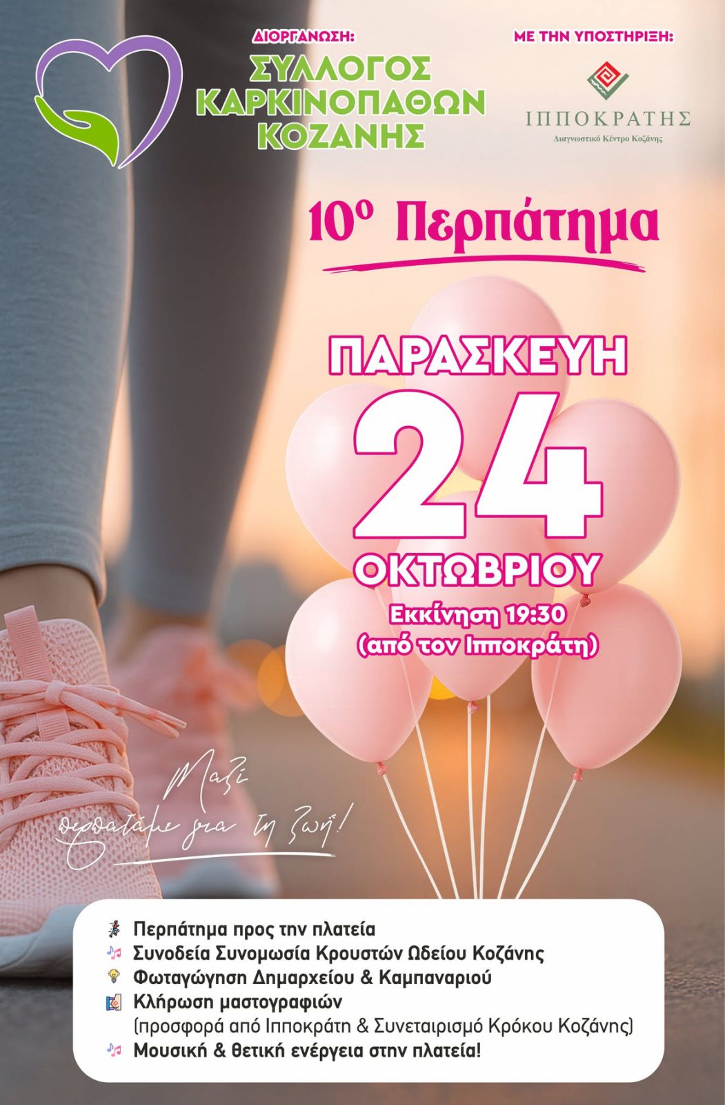 Για ακόμη μία χρονιά, ο Σύλλογος Καρκινοπαθών Κοζάνης με την υποστήριξη του Διαγνωστικού Κέντρου «Ιπποκράτης», διοργανώνει την καθιερωμένη Ροζ Πορεία Ελπίδας, μια δυναμική δράση που ενώνει φωνές και καρδιές στον αγώνα κατά του καρκίνου του μαστού.