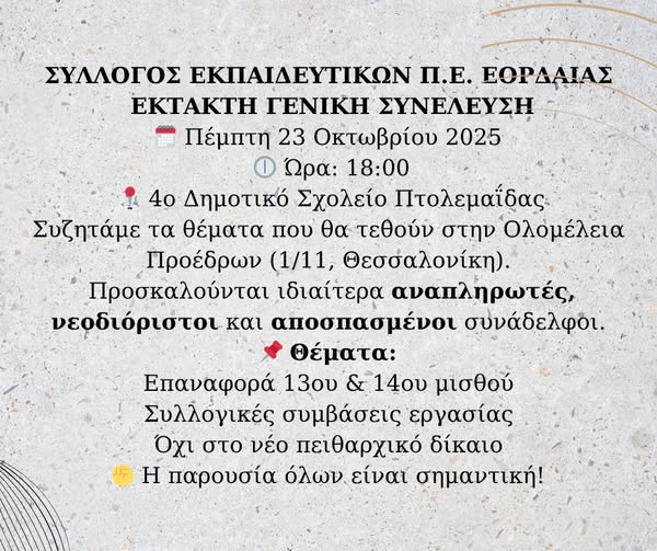 Ο Σύλλογος Εκπαιδευτικών Πρωτοβάθμιας Εκπαίδευσης Εορδαίας καλεί τα μέλη του σε Έκτακτη Γενική Συνέλευση αύριο h-2025, στις 18:00, στο 4o Δημοτικό Σχολείο Πτολεμαΐδας για να συζητήσουν σημαντικά ζητήματα που τους απασχολούν, τα οποία και θα τεθούν στην Ολομέλεια των Προέδρων την 1η Νοεμβρίου στη Θεσσαλονίκη. Ιδιαίτερη μνεία για τη συμμετοχή τους στη έκτακτη διαδικασία γίνεται για τους Αναπληρωτές, τους νεοδιόριστους και τους αποσπασμένους. Τα θέματα που πρόκειται να συζητηθούν αφορούν στα: