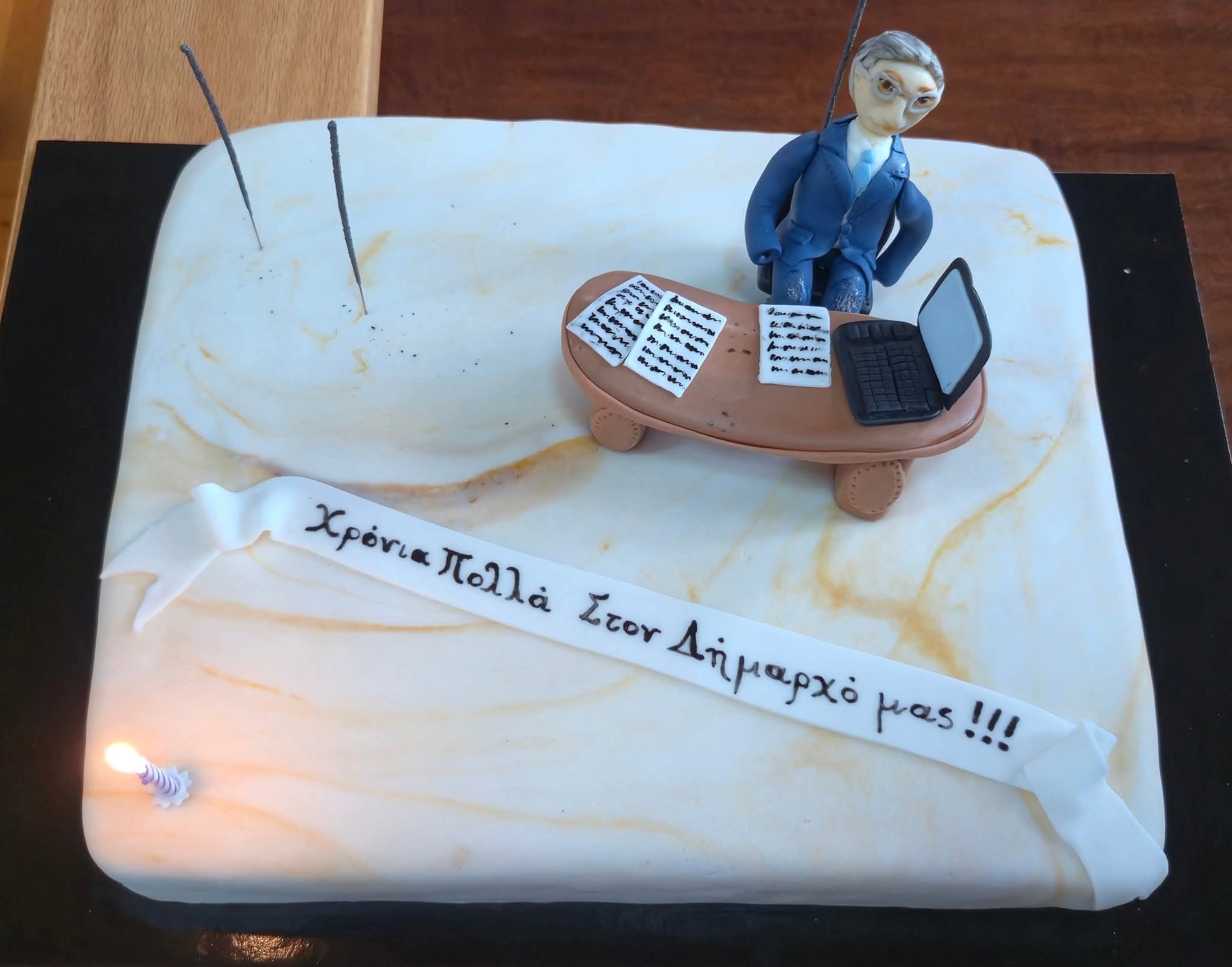 «55 χρόνων σήμερα. Ευχαριστώ όλους για τις ευχές σας. Ιδιαίτερα ευχαριστώ τους συνεργάτες μου στο Δήμο για την ευχάριστη έκπληξη και την πολύ όμορφη τούρτα!».