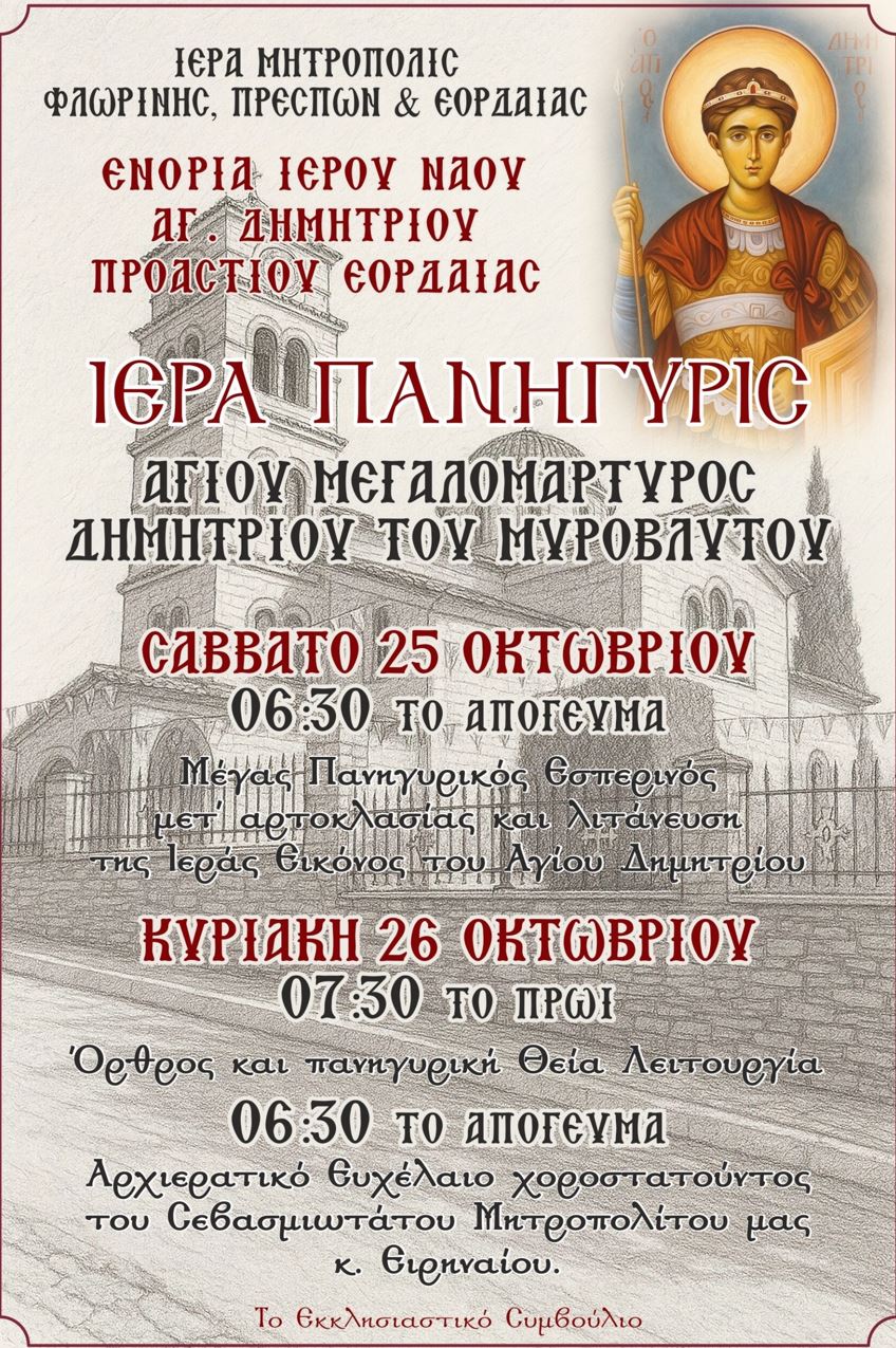 Η Ιερά Μητρόπολη Φλωρίνης, Πρεσπών και Εορδαίας και η Ενορία του Ιερού Ναού Αγίου Δημητρίου Προαστίου Εορδαίας ανακοινώνουν την τέλεση της Ιεράς Πανηγύρεως προς τιμήν του Αγίου Μεγαλομάρτυρος Δημητρίου του Μυροβλύτου.