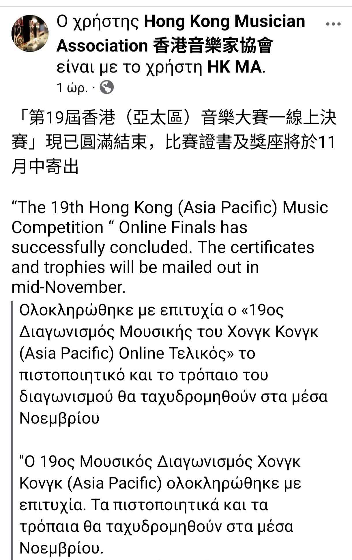 Με συγκίνηση και βαθιά υπερηφάνεια ανακοινώνουμε ότι ο μαθητής του Musicart – Νέο Ωδείο Κοζάνης, Δημήτριος-Μάριος Γκάνης, με καθηγήτρια στο τραγούδι την κ. Φωτεινή Γκιουλέκα, κατέκτησε Χρυσό Βραβείο (Gold Award) στην κατηγορία Junior Popular Singing του 19ου Διεθνούς Μουσικού Διαγωνισμού Χονγκ Κονγκ (Asia Pacific).