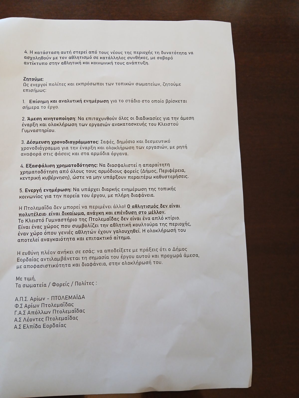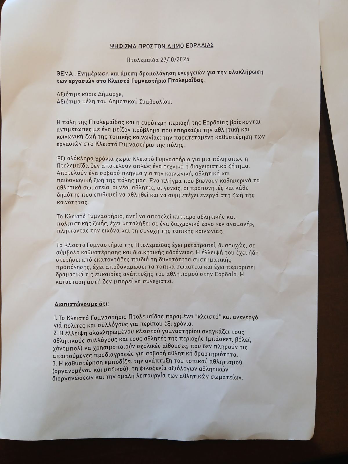 Πραγματοποιήθηκε, το μεσημέρι της Δευτέρας 27 Οκτωβρίου 2025, η προγραμματισμένη συγκέντρωση διαμαρτυρίας που διοργάνωσαν αθλητικά σωματεία της Πτολεμαΐδας, μπροστά στο Δημαρχείο Εορδαίας, για την πολύχρονη καθυστέρηση στην αποπεράτωση του έργου του Κλειστού Γυμναστηρίου. Η πόλη εξακολουθεί να παραμένει χωρίς σύγχρονο χώρο άθλησης με τους εκπροσώπους των συλλόγων να ζητούν να δοθεί άμεση λύση .