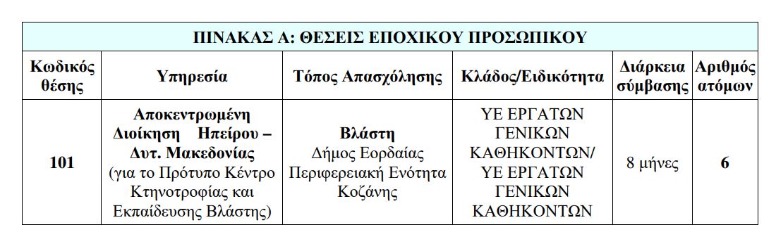 Πρόσληψη, με σύμβαση εργασίας ιδιωτικού δικαίου ορισμένου χρόνου, συνολικά έξι (6) ατόμων, στην Αποκεντρωμένη Διοίκηση Ηπείρου – Δυτικής Μακεδονίας για την κάλυψη αναγκών του Πρότυπου Κέντρου Κτηνοτροφίας & Εκπαίδευσης Βλάστης, που εδρεύει στην Βλάστη του Δήμου Εορδαίας της Περιφερειακής Ενότητας Κοζάνης.