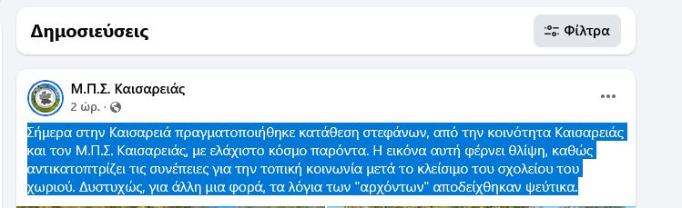 Στην Καισαρειά Κοζάνης, τιμή στους ήρωες και ένα βουβό παράπονο για το σχολείο που έκλεισε. Το μήνυμα απογοήτευσης του Μ.Π.Σ. Καισαρειάς: “Σήμερα στην Καισαρειά πραγματοποιήθηκε κατάθεση στεφάνων, από την κοινότητα Καισαρειάς και τον Μ.Π.Σ. Καισαρειάς, με ελάχιστο κόσμο παρόντα. Η εικόνα αυτή φέρνει θλίψη, καθώς αντικατοπτρίζει τις συνέπειες για την τοπική κοινωνία μετά το κλείσιμο του σχολείου του χωριού. Δυστυχώς, για άλλη μια φορά, τα λόγια των “αρχόντων” αποδείχθηκαν ψεύτικα“.