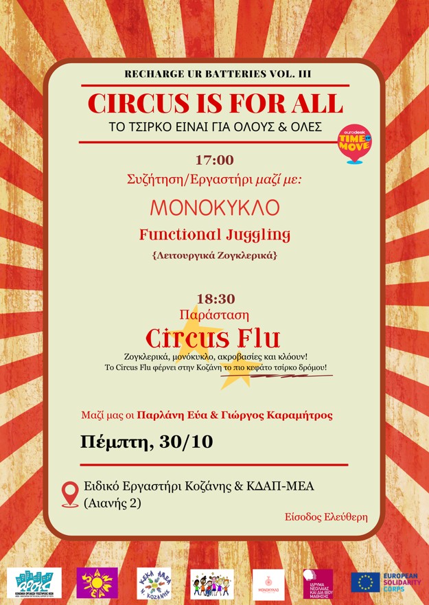 Η S.A.N. Team της ΑΡΣΙΣ Κοζάνης σας καλεί στην εκδήλωση Circus is for All, του 3ου Recharge Your Batteries Festival, την Πέμπτη 30 Οκτωβρίου, στις 17:00, στο χώρο του Ειδικού Εργαστηρίου Κοζάνης και του ΚΔΑΠ-μεΑ Δήμου Κοζάνης (Αιανής 2).
