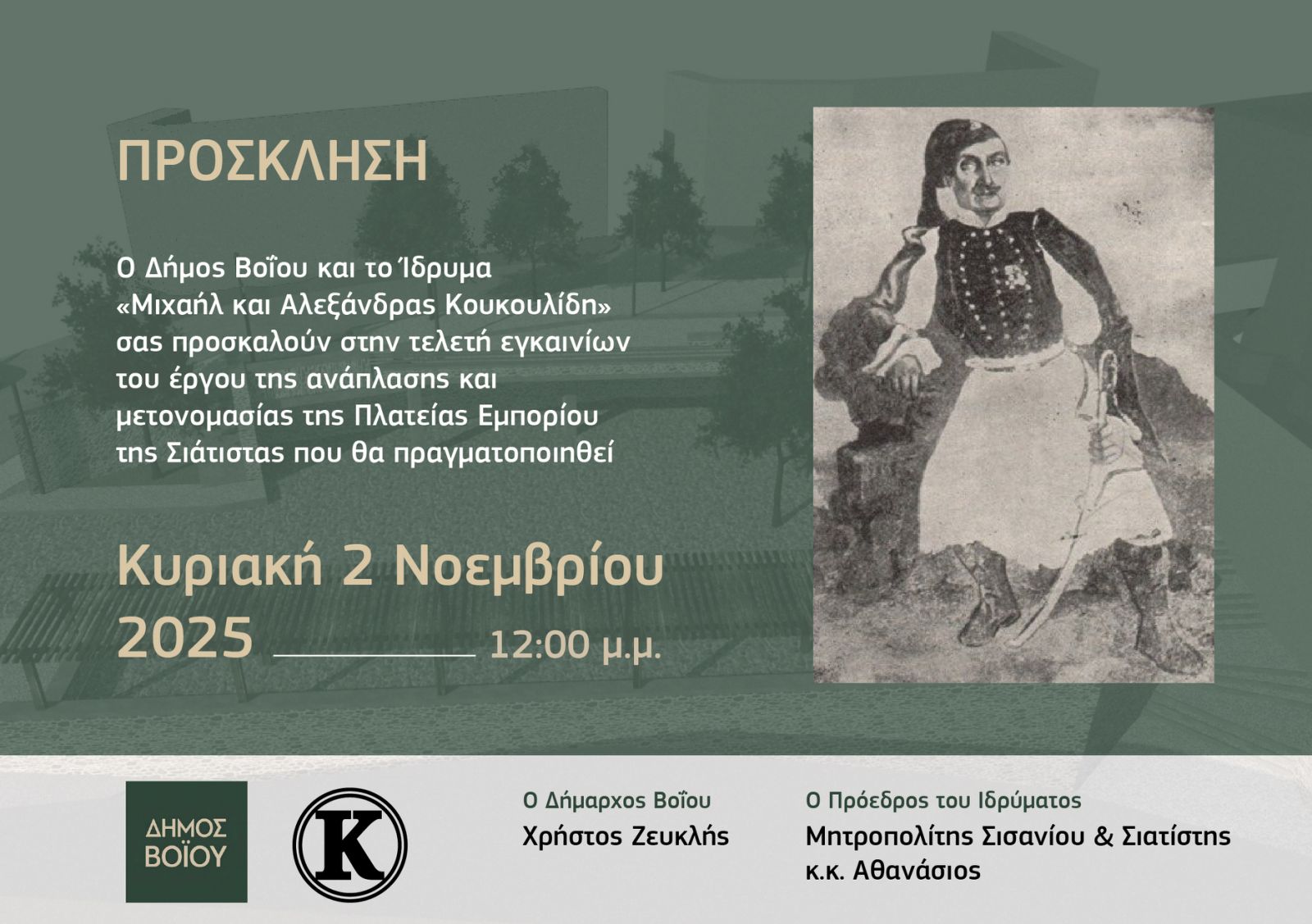 Ο Δήμος Βοΐου και το Ίδρυμα «Μιχαήλ & Αλεξάνδρας Κουκουλίδη» σας προσκαλούν στην τελετή εγκαινίων του έργου ανάπλασης και μετονομασίας της Πλατείας Εμπορίου Σιάτιστας.