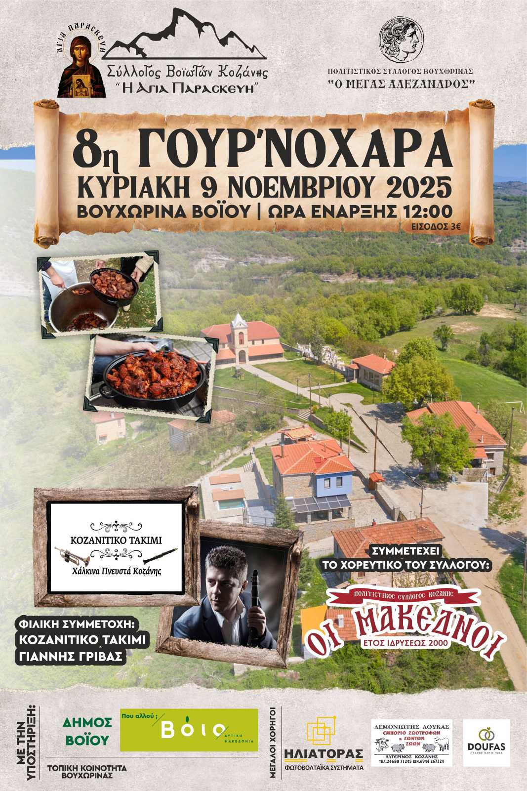 Ο Σύλλογος Βοϊωτών Κοζάνης «Η ΑΓΙΑ ΠΑΡΑΣΚΕΥΗ» σας προσκαλεί στην 8η ΓΟΥΡ’ΝΟΧΑΡΑ, την Κυριακή 09 Νοεμβρίου 2025 και ώρα 12:00 (μεσημέρι).