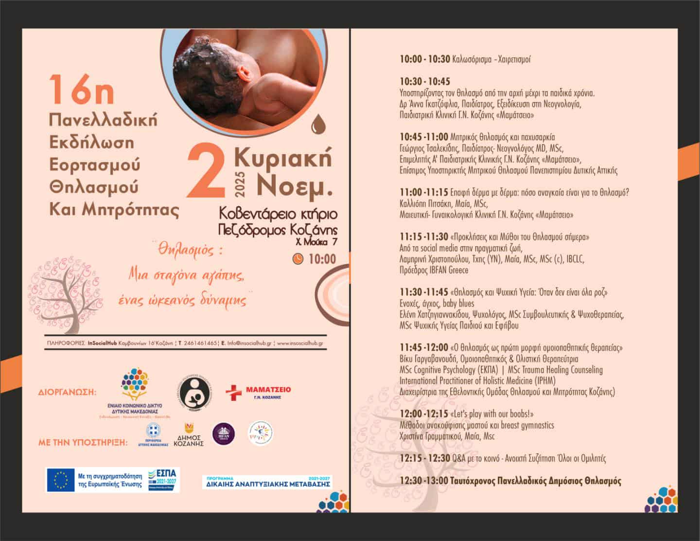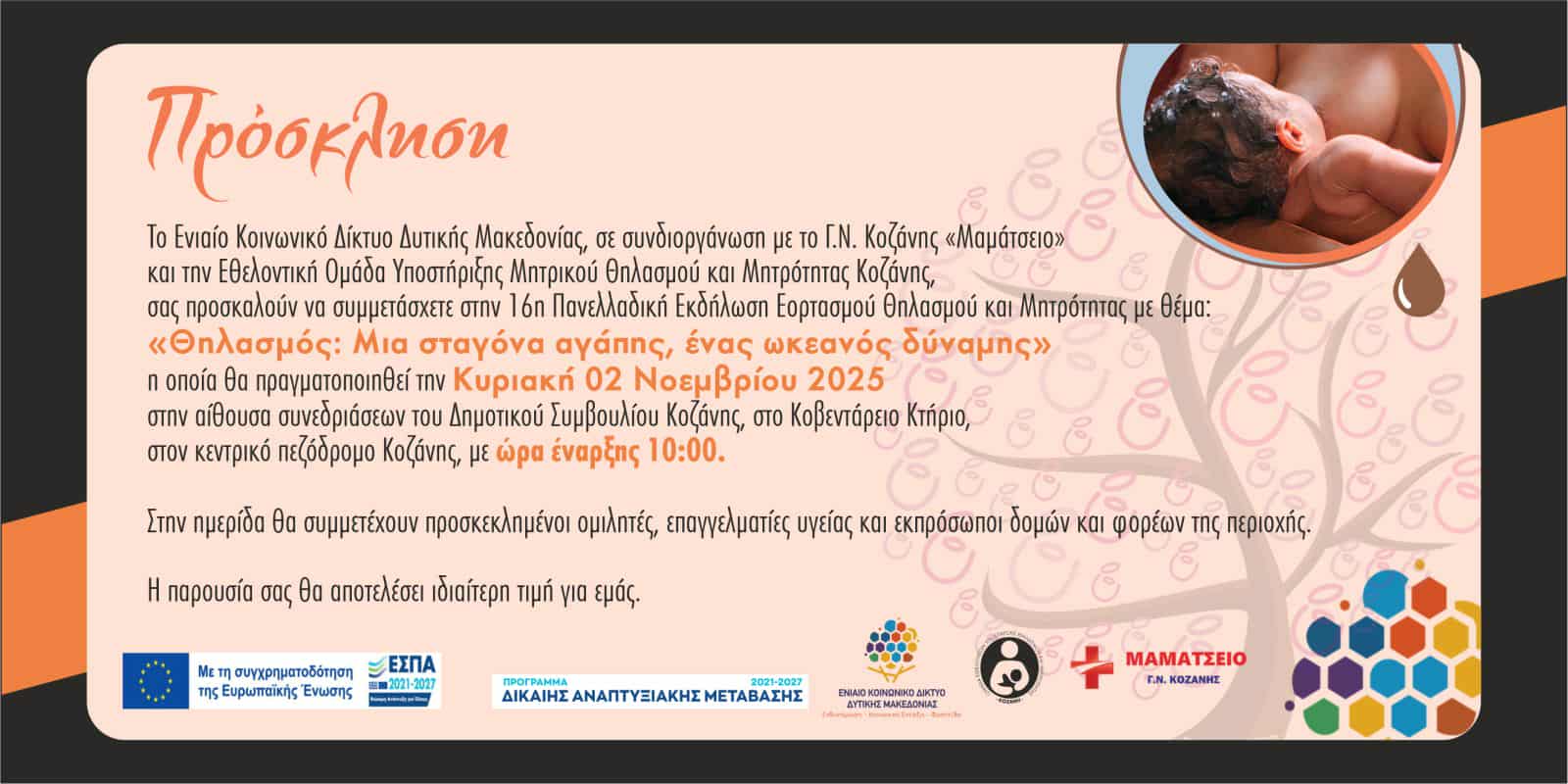 Την Κυριακή 2 Νοεμβρίου 2025, στις 10:00 το πρωί, θα πραγματοποιηθεί στο Κοβεντάρειο Κτήριο του Πεζόδρομου Κοζάνης η 16η Πανελλαδική Εκδήλωση Εορτασμού Θηλασμού και Μητρότητας, με θέμα «Θηλασμός: Μια σταγόνα αγάπης, ένας ωκεανός δύναμης».